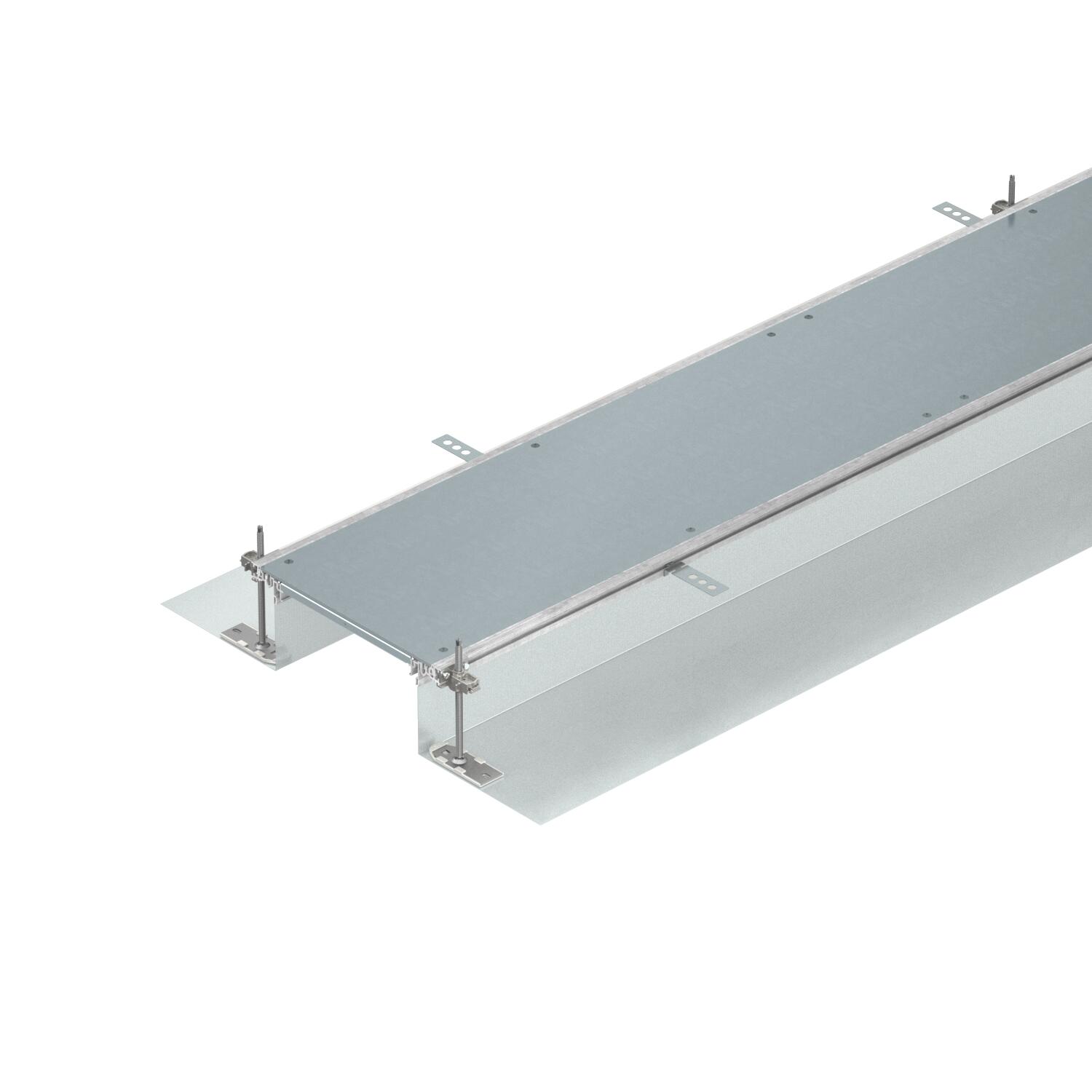 Product descriptionReady-to-mount trunking unit for cable routing consisting of 3 blind lids, 2 side profiles with attached flexible side wall made of metal mesh, floor covering contact profiles with a height H of 3 mm. The scope of supply contains six height-adjustable fastening brackets, six screed anchors and three lid butt seals for nominal trunking widths 200, 300 and 400mor six lid butt supports for trunking widths 500 and 600. The essential levelling units (observe height adjustment) for the 400, 500 and 600 lid supports are not contained in the scope of delivery and should be ordered separately. On delivery, the trunking lids are screwed on.