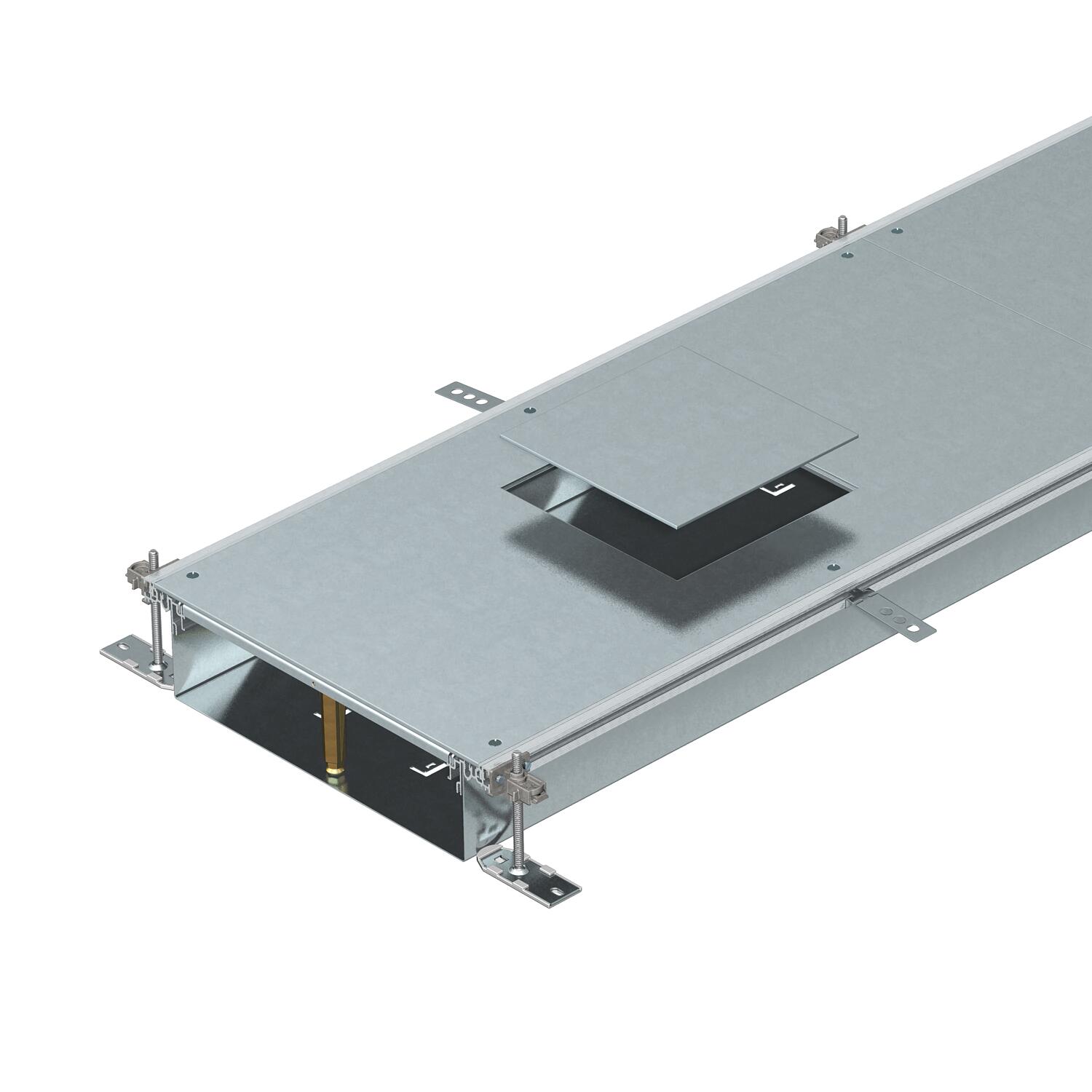Product descriptionReady-to-mount trunking unit with three or six device installation lids for cable laying and the installation of flush-mount units of nominal size 4, consisting of the trunking base (floor trough with side and floor covering contact profiles) and trunking lid with blank covered mounting opening. Floor trough with holding straps for self-contacting mounting of separating retainers. The scope of delivery contains 6 height-adjustable fixing brackets, 6 screed anchors and lid butt seals (3x for nominal trunking widths of 200 and 300) or height-adjustable lid butt supports: 3x for nominal trunking width 400 and 6x for nominal trunking widths 500 and 600. Trunking lid screwed down when delivered.