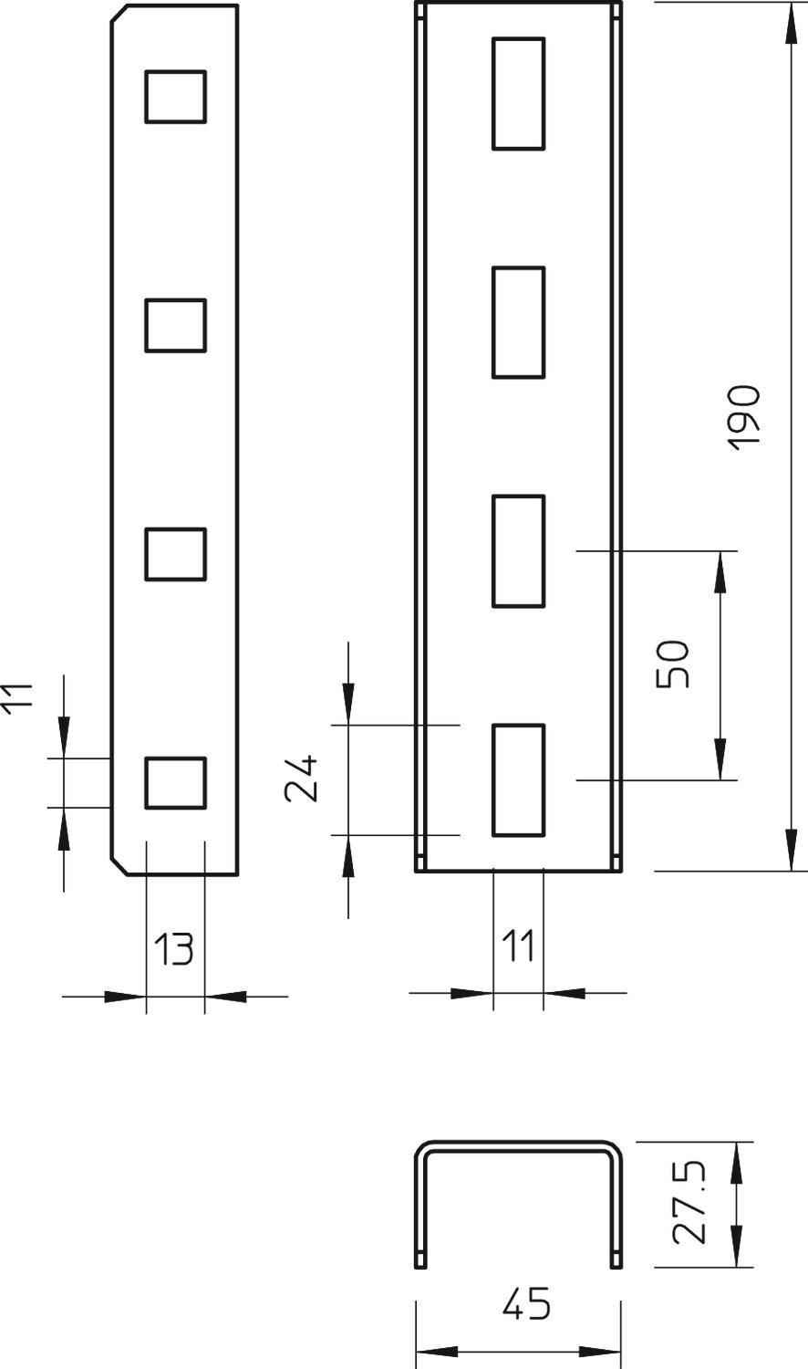 CO2 Footprint (GWP) Cradle-to-Gate 1,2584 kg CO2e / 1 Piece Colour zinc Dimension 27,5 x 45 x 190 Dimension 190x45 Drill hole spacing, centre 50 mm Height 27,5 mm Length 190 mm Material Steel Rustproof steel, pickled no Suitable for profile shapes U profile Surface Hot-dip galvanised Width 45 mm With screw accessories yes - All types