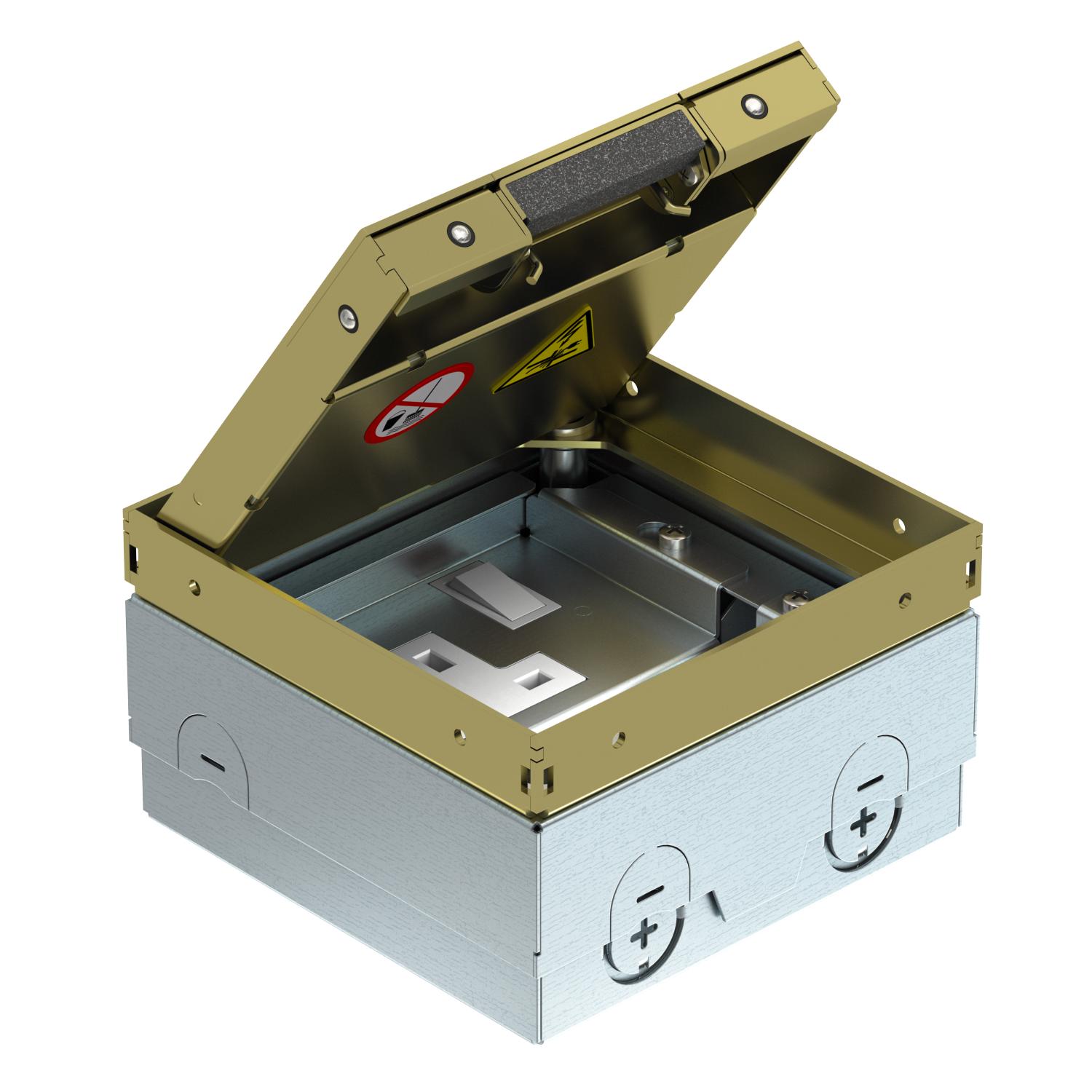 Product descriptionSquare floor socket for use in dry-care systems and screed floors in indoor areas. Installation housing with pre-marked insertion openings for pipes (M20/M25). Cover adjustable to top edge of floor covering using four height-adjustment supports. The minimum installation depth is 85 mm, the height adjustment range +20 mm. Frame and cover made of brass and visible in the floor covering. Cover with floor covering recess. The delivery includes a switched BS socket.