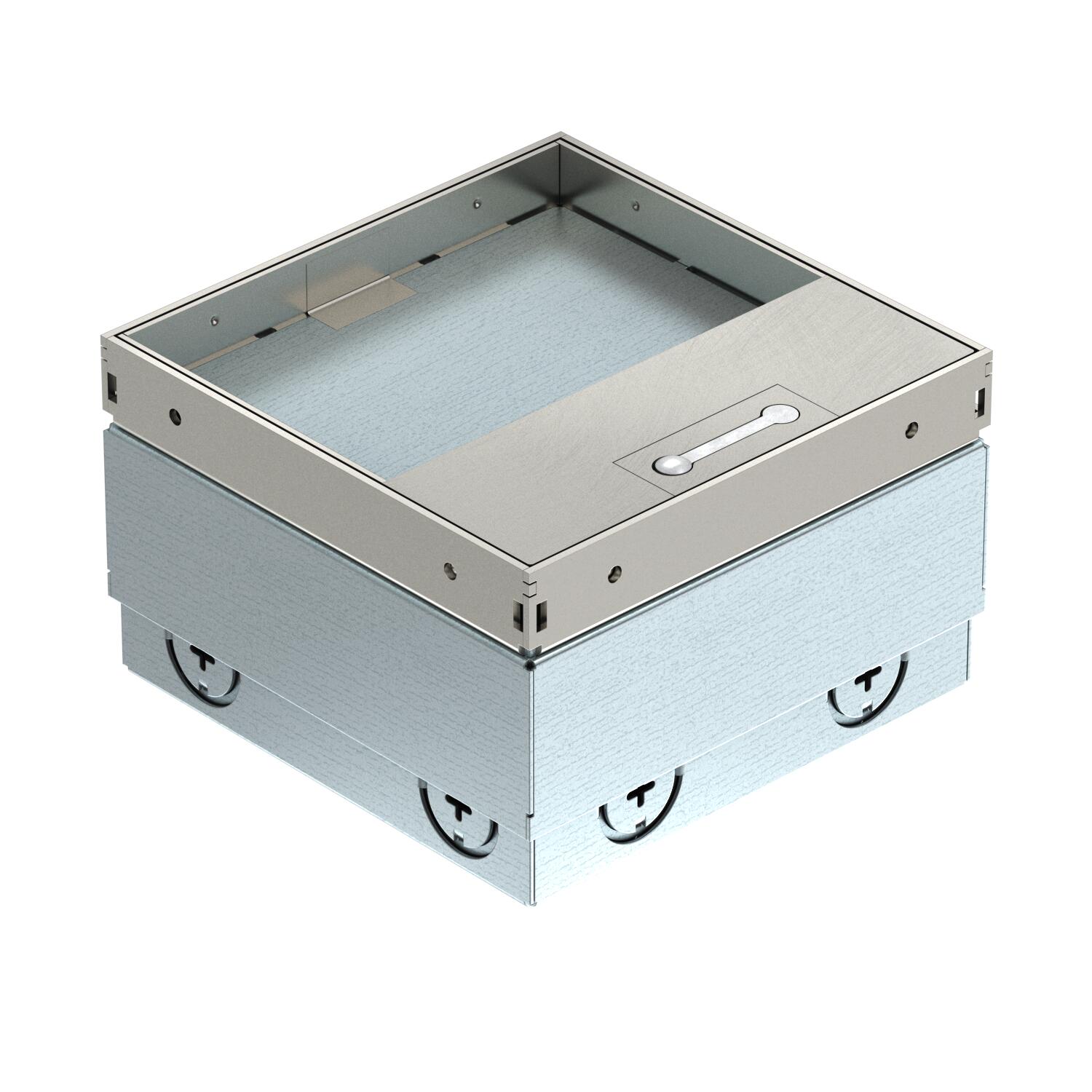 Product descriptionSquare floor socket for use in dry-care cavity and screed floors in indoor areas. Installation housing with pre-marked insertion openings for pipes (M20/M25). Cover adjustable to top edge of floor covering using four height-adjustment supports. The minimum installation depth is 110 mm, the height-adjustment range 25 mm. Frame and cover made of stainless steel and visible in the floor covering. Cover with floor covering recess and brush bar for cable routing. Empty housing for up to 2 Modul 45® devices in the mounting support and 2 data sockets in the optional data technology support.