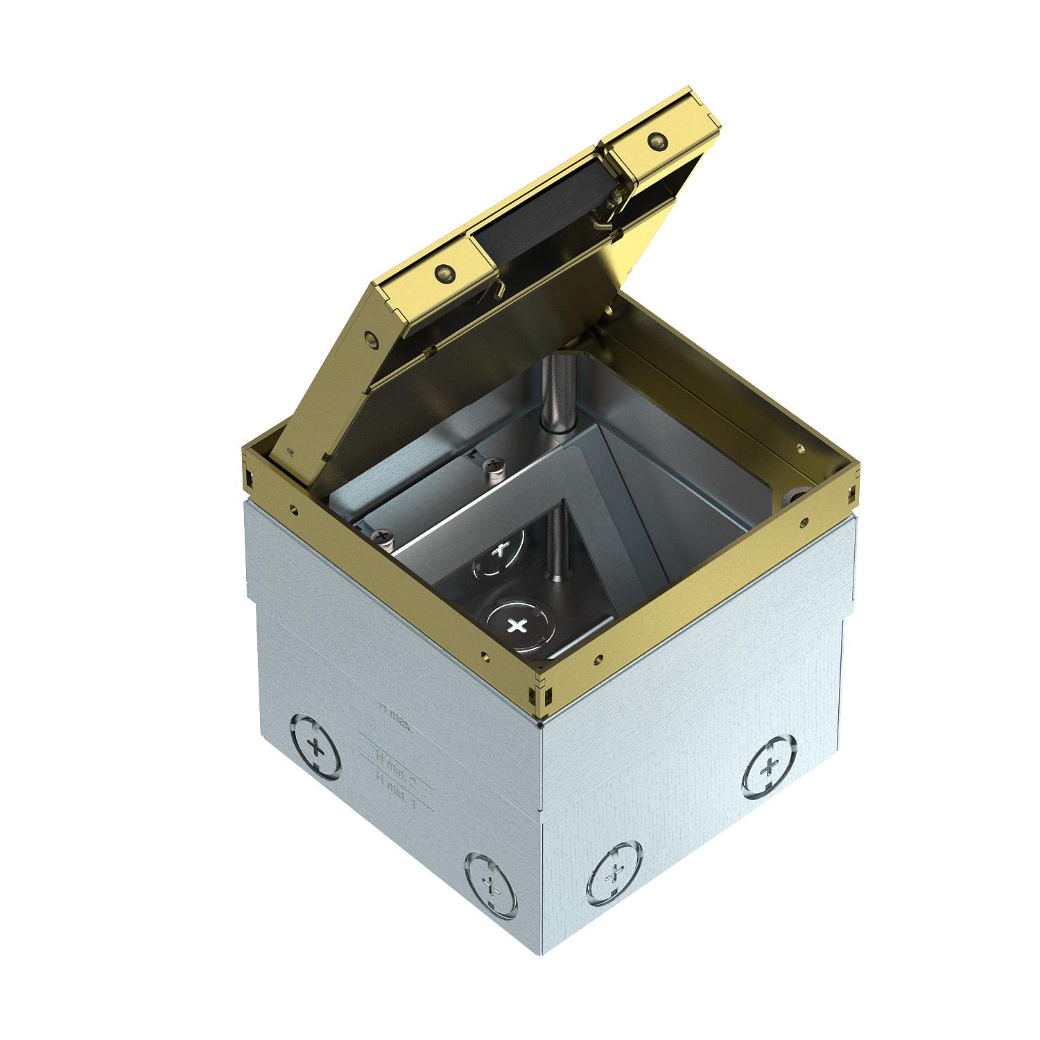 Product descriptionSquare floor socket for use in dry-care cavity and screed floors in indoor areas. Installation housing with pre-marked insertion openings for pipes (M20/M25). Cover adjustable to top edge of floor covering using four height-adjustment supports. The minimum installation depth is 110 mm, the height-adjustment range 25 mm.Frame and cover made of brass and visible in the floor covering. Empty housing for up to 2 Modul 45® devices in the mounting support and 2 data sockets in the optional data technology support.