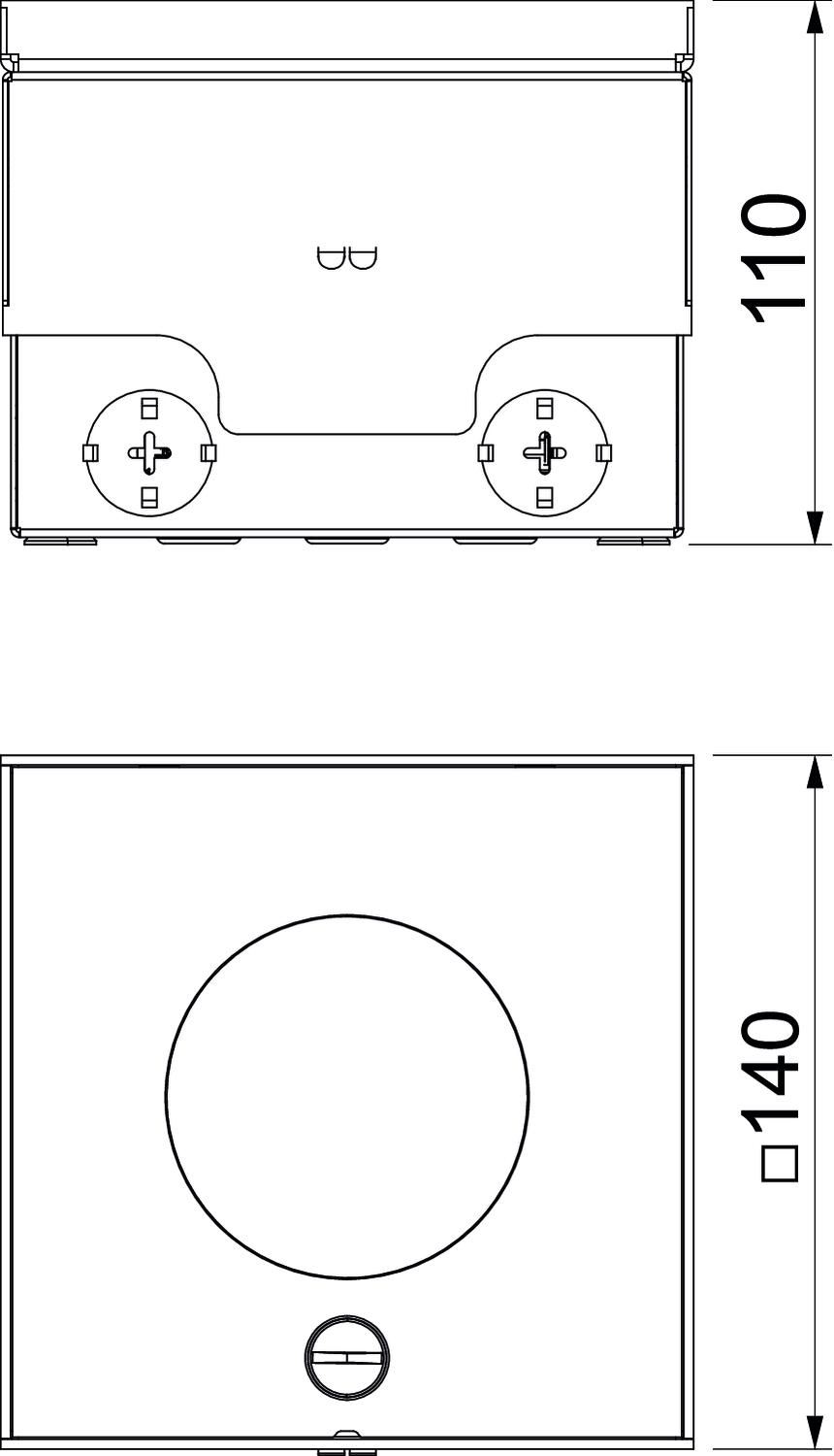 Product descriptionSquare installation unit for use in dry and wet-cleaned cavity and screed floors. Installation housing with pre-marked insertion openings for pipes (M25). Cover adjustable to top edge of floor covering using four height-adjustment supports. The minimum installation depth is 110 mm, the height-adjustment range +25 mm.
