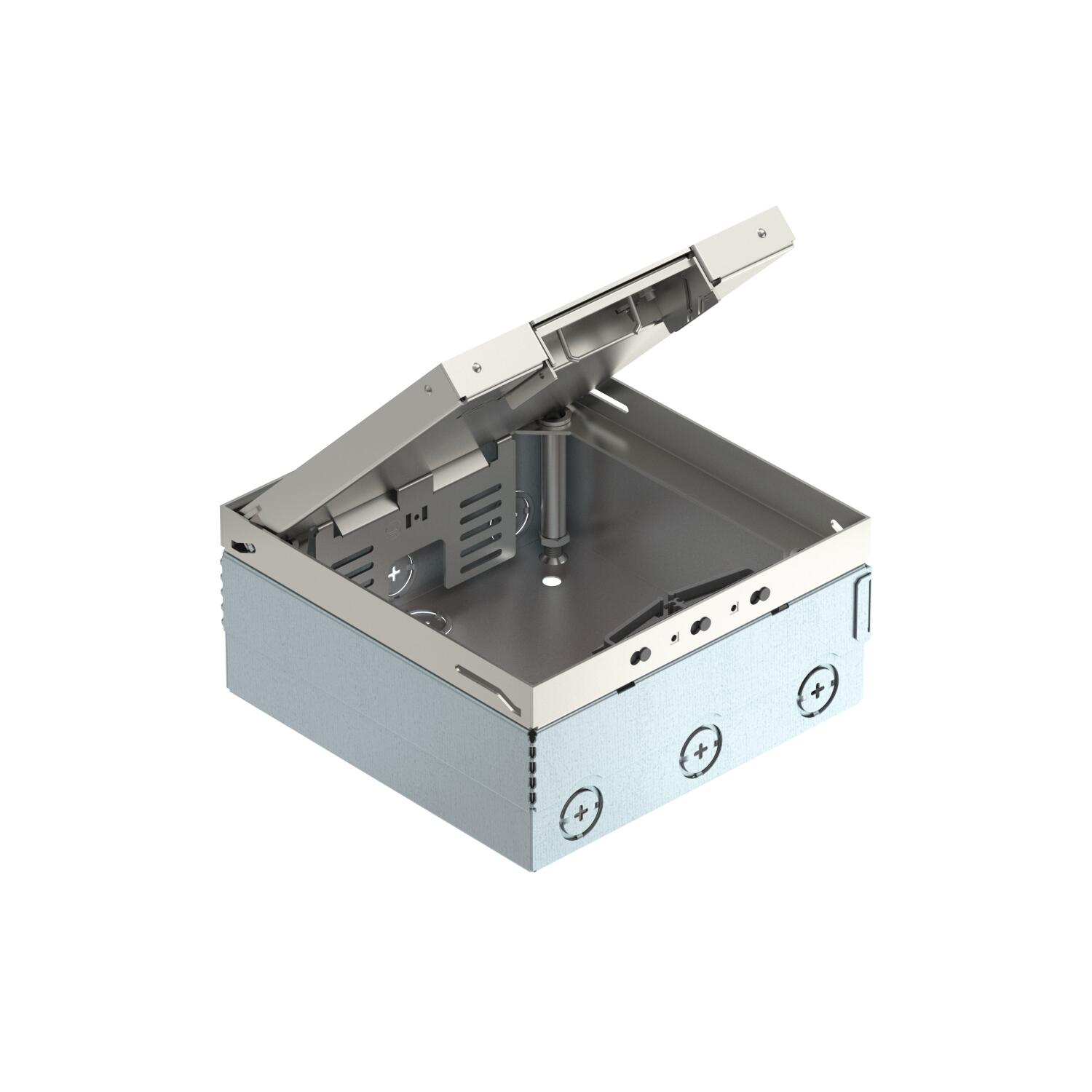 Product descriptionSquare floor box for use in dry-cleaned cavity and screed floors in indoor areas. Installation housing with pre-marked insertion openings for pipes (M25). Empty housing for up to 2 UT3 universal supports for up to 6 Modul 45 ® devices. Cover adjustable to top edge of floor covering using four height-adjustment supports. The minimum installation depth is 95 mm, the height-adjustment range + 30 mm.