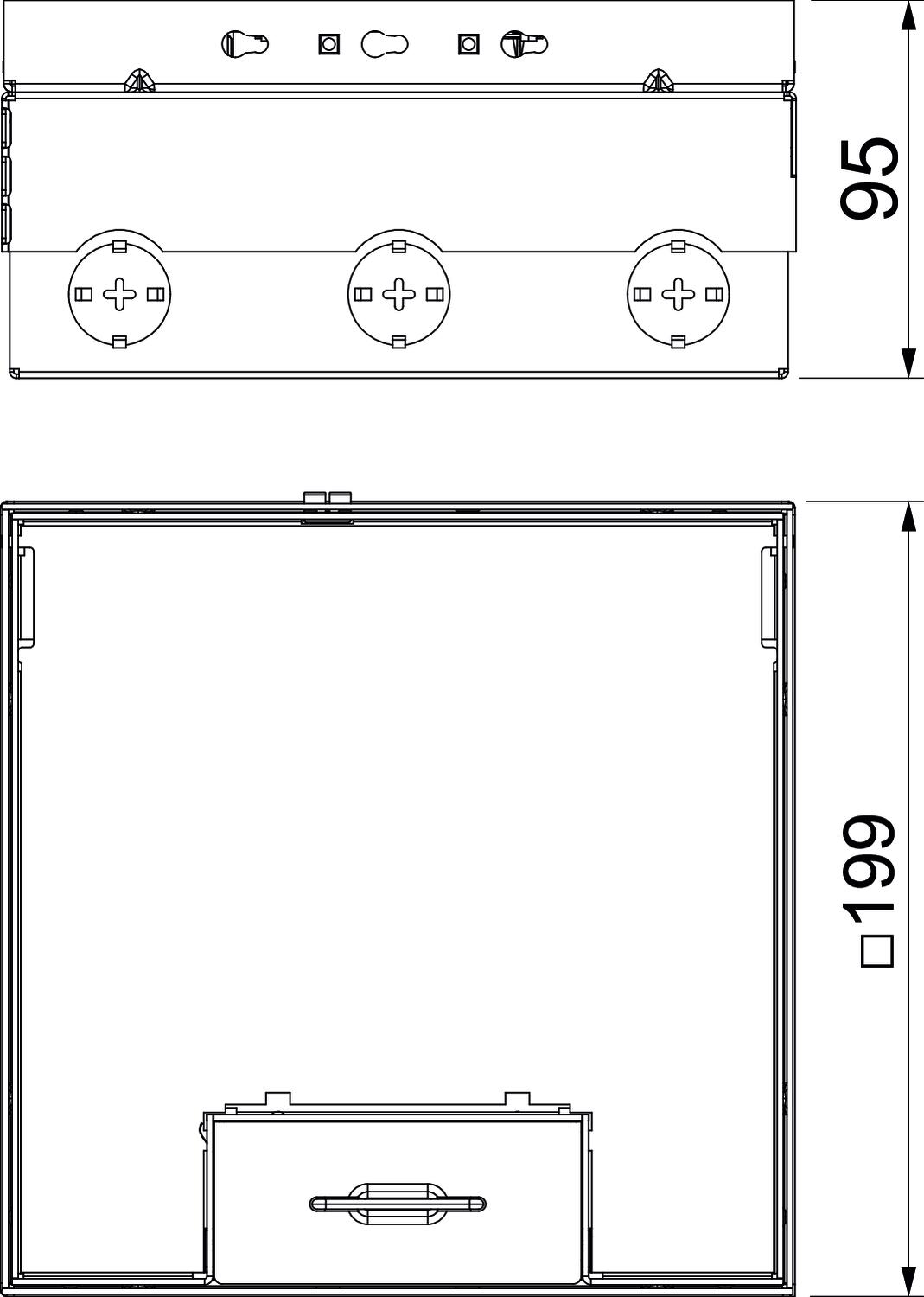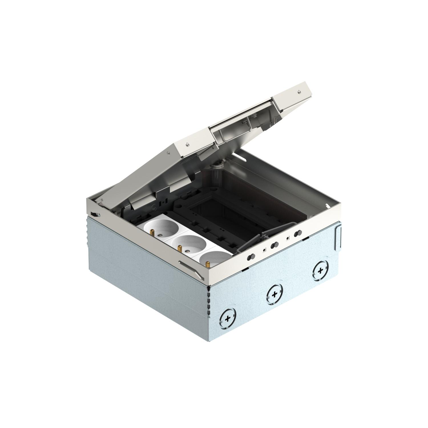 Product descriptionSquare floor box for use in dry-cleaned cavity and screed floors for indoor use. Installation housing with pre-marked insertion openings for pipes (M25). Cover adjustable to top edge of floor covering using four height-adjustment supports. 15 mm floor covering recess in the hinged cover. The minimum installation depth is 95 mm, the height-adjustment range + 30 mm.