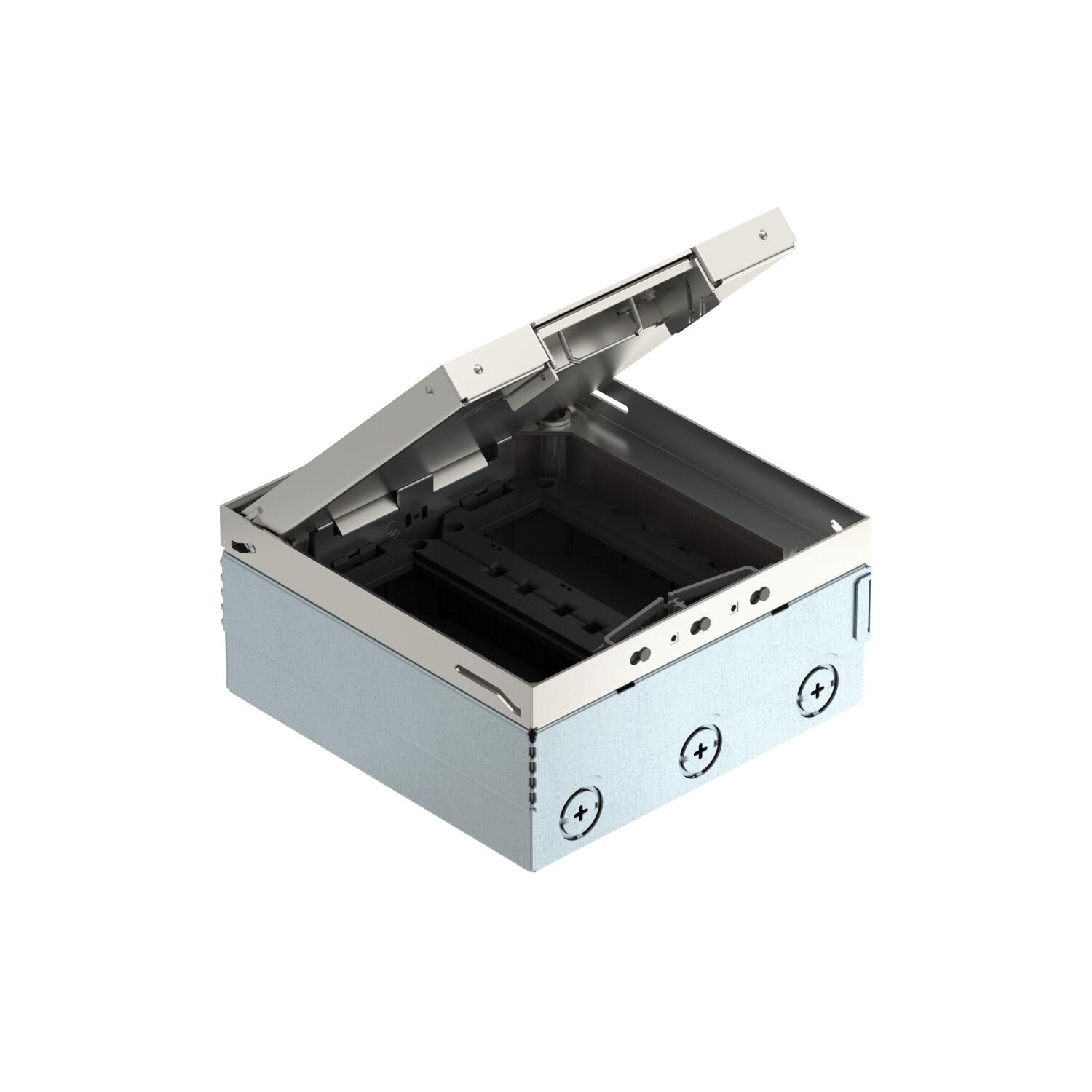 Product descriptionSquare floor box for use in dry-cleaned cavity and screed floors in indoor areas. Installation housing with pre-marked insertion openings for pipes (M25). With two UT3 45 3 universal supports. Cover adjustable to top edge of floor covering using four height-adjustment supports. The minimum installation depth is 95 mm, the height-adjustment range + 30 mm.