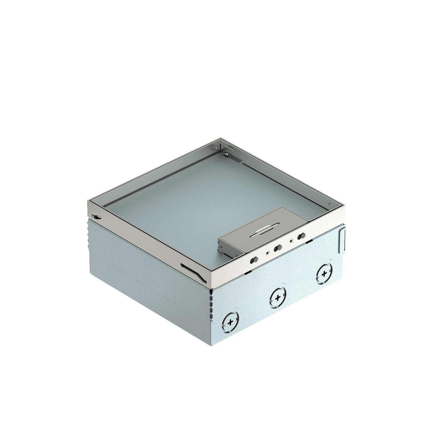 Product descriptionSquare floor box for use in dry-cleaned cavity and screed floors for indoor use. Installation housing with pre-marked insertion openings for pipelines (M25). Cover adjustable to top edge of floor covering using four height-adjustment supports. 15 mm floor covering recess in the hinged cover. The minimum installation depth is 95 mm, the height-adjustment range + 30 mm.