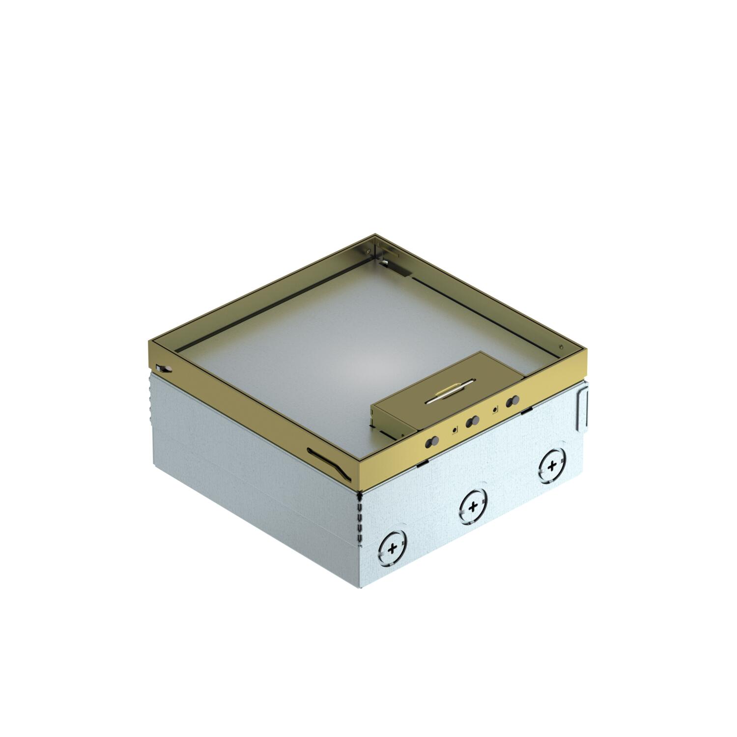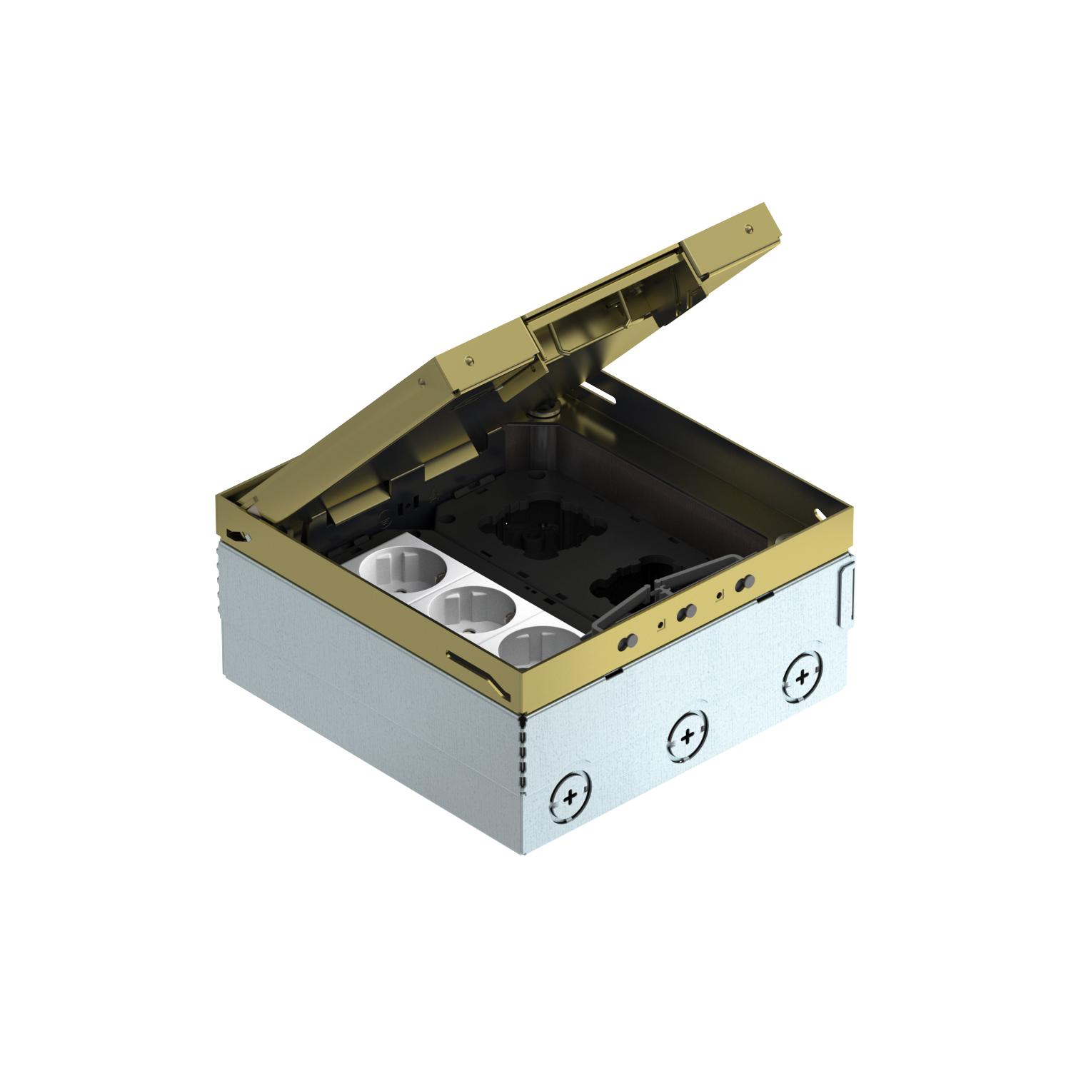 Product descriptionSquare floor box for use in dry-cleaned cavity and screed floors in indoor areas. Installation housing with pre-marked insertion openings for pipes (M25). With two UT3 universal supports and a triple socket. Cover adjustable to top edge of floor covering using four height-adjustment supports. The minimum installation depth is 95 mm, the height-adjustment range + 30 mm.