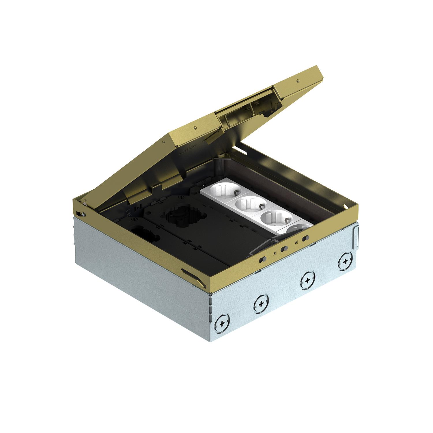 Product descriptionSquare floor box for use in dry-cleaned cavity and screed floors in indoor areas. Installation housing with pre-marked insertion openings for pipes (M25). With three UT4 universal supports and two double sockets. Cover adjustable to top edge of floor covering using four height-adjustment supports. The minimum installation depth is 95 mm, the height-adjustment range + 30 mm.
