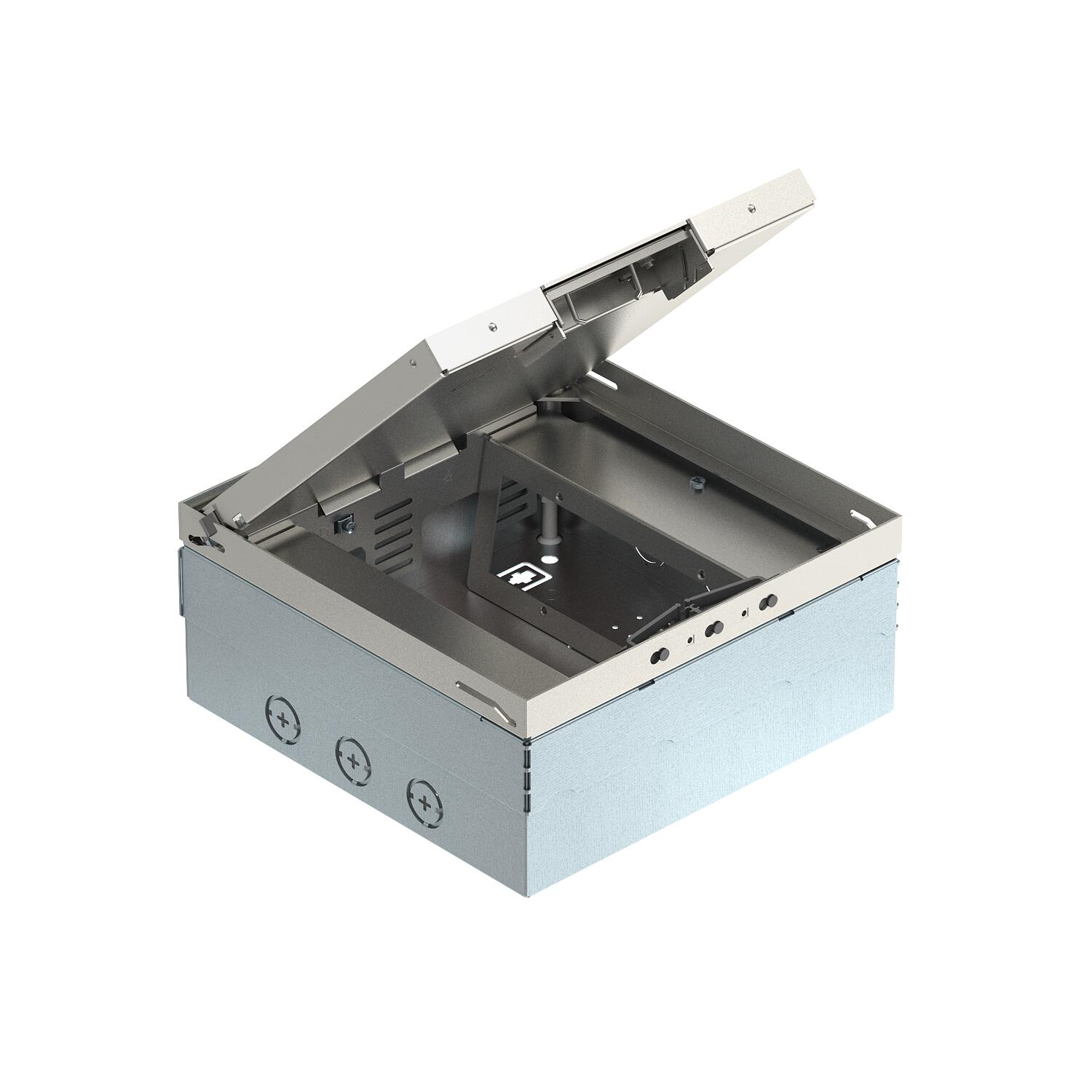 Product descriptionSquare floor box for 14 installation devices of Italian design, for use in dry-care cavity and screed floors for indoor use. Installation housing with pre-marked insertion openings for pipelines (M25). Cover adjustable to top edge of floor covering using four height-adjustment supports. 15 mm floor covering recess in the hinged cover. The minimum installation depth is 110 mm, the height-adjustment range + 30 mm.