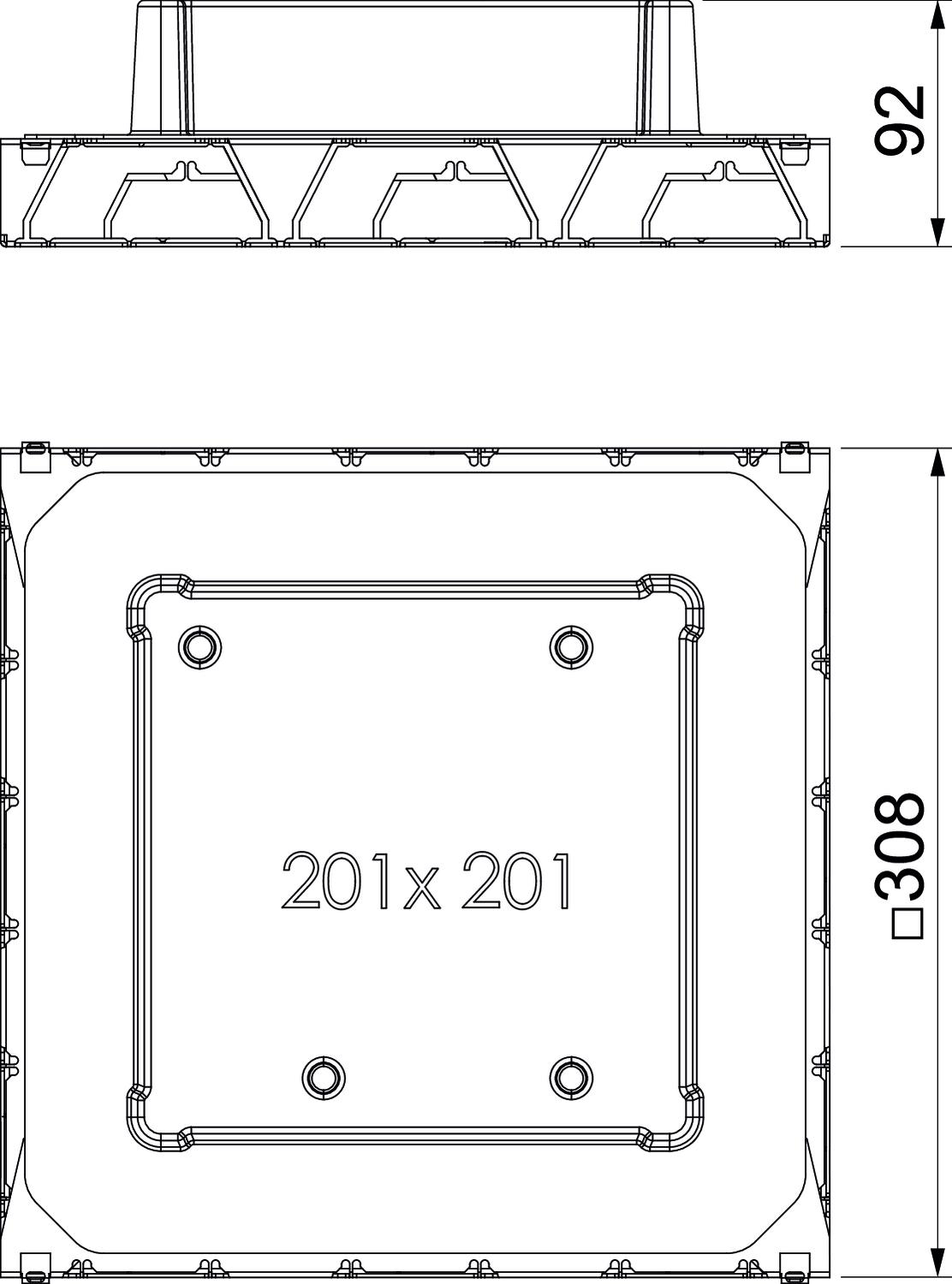 Product descriptionUnderfloor outlet box with fixed, unchangeable 201 x 201 mm installation opening for an installation unit of nominal size 4. The mounting opening is created using the screed protection cover contained in the scope of supply. The underfloor box possesses installation openings for three single-compartment PVC ducts of nominal size 60 x 25 and 90 x 35 on all four sides. The box is principally suited for use in floor structures in cement screed with a structure height of up to 90 mm.