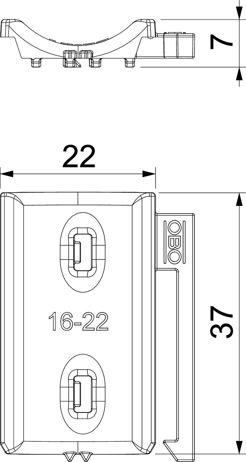 Clamping range D, max. 22 mm Clamping range D, min. 16 mm CO2 Footprint (GWP) Cradle-to-Gate 0,011 kg CO2e / 1 Piece Colour Light grey; RAL 7035 Counter-trough/clip version Counter sleeve Dimension 16-22mm Dimension B 27,5 mm Dimension H 6,8 mm Dimension L 37 mm Material Polypropylene Suitable for max. cable diameter 22 mm - All types