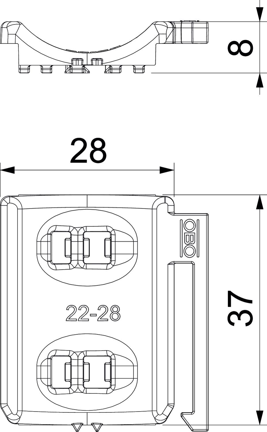 Clamping range D, max. 28 mm Clamping range D, min. 22 mm CO2 Footprint (GWP) Cradle-to-Gate 0,0145 kg CO2e / 1 Piece Colour Light grey; RAL 7035 Counter-trough/clip version Counter sleeve Dimension 22-28mm Dimension B 33,5 mm Dimension H 8,3 mm Dimension L 37 mm Material Polypropylene Suitable for max. cable diameter 28 mm - All types
