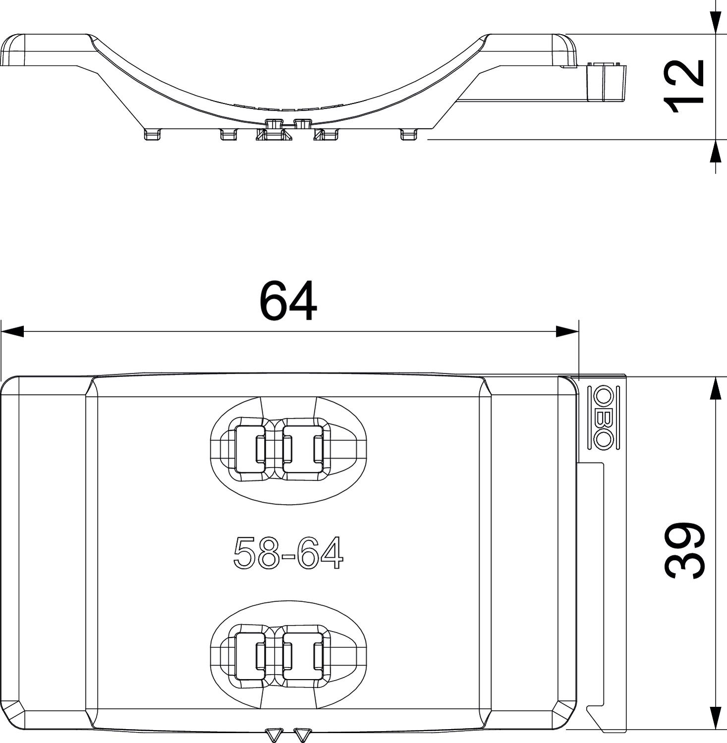 Clamping range D, max. 64 mm Clamping range D, min. 58 mm CO2 Footprint (GWP) Cradle-to-Gate 0,0287 kg CO2e / 1 Piece Colour Light grey; RAL 7035 Counter-trough/clip version Counter sleeve Dimension 58-64mm Dimension B 69,5 mm Dimension H 11,8 mm Dimension L 40 mm Material Polypropylene Suitable for max. cable diameter 64 mm - All types