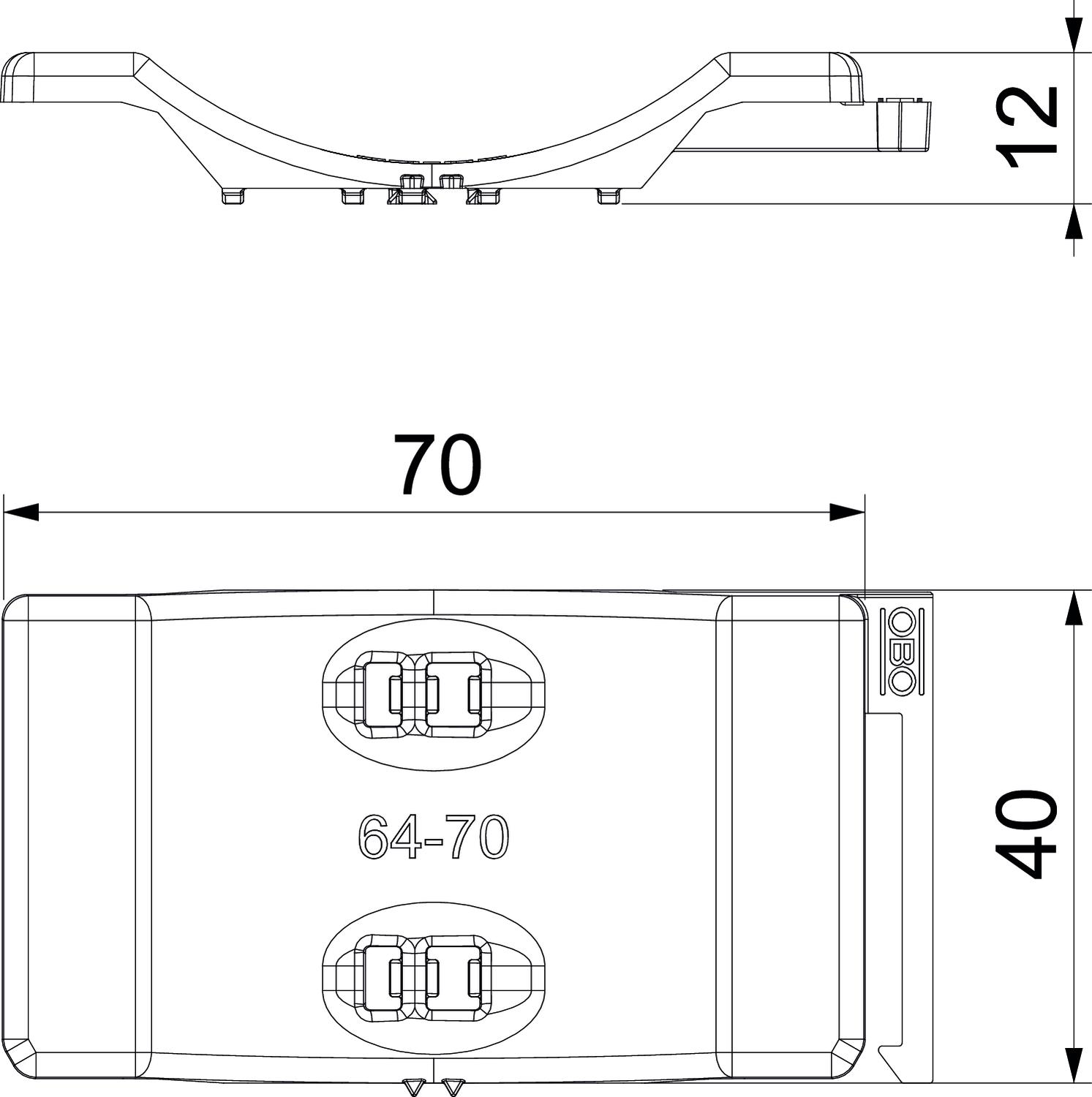 Clamping range D, max. 70 mm Clamping range D, min. 64 mm CO2 Footprint (GWP) Cradle-to-Gate 0,0363 kg CO2e / 1 Piece Colour Light grey; RAL 7035 Counter-trough/clip version Counter sleeve Dimension 64-70mm Dimension B 75,5 mm Dimension H 12,3 mm Dimension L 40 mm Material Polypropylene Suitable for max. cable diameter 70 mm - All types