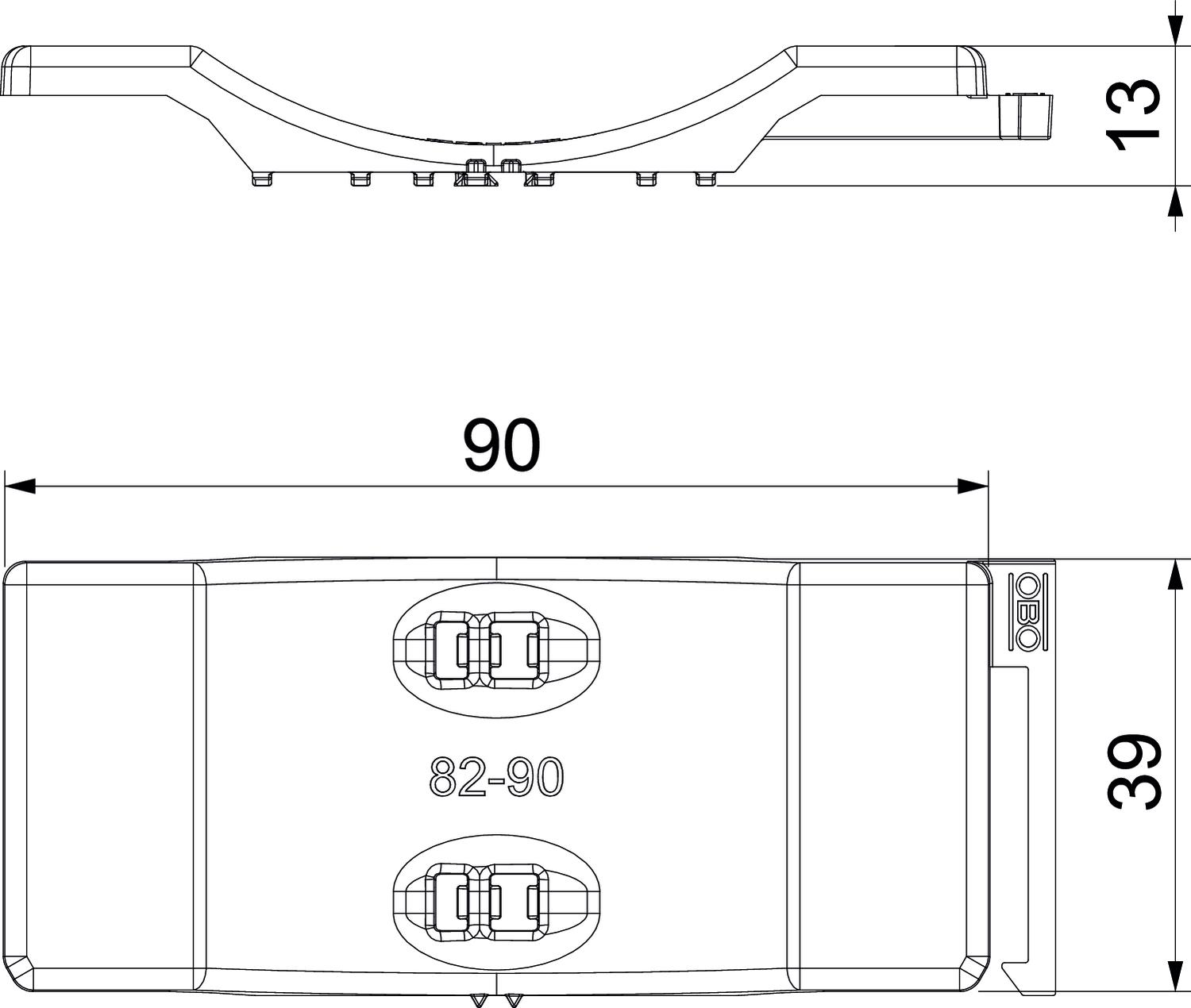 Clamping range D, max. 90 mm Clamping range D, min. 82 mm CO2 Footprint (GWP) Cradle-to-Gate 0,0483 kg CO2e / 1 Piece Colour Light grey; RAL 7035 Counter-trough/clip version Counter sleeve Dimension 82-90mm Dimension B 96 mm Dimension H 12,8 mm Dimension L 40 mm Material Polypropylene Suitable for max. cable diameter 90 mm - All types