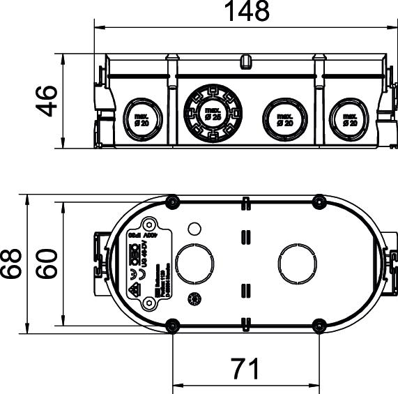Airtight no CO2 Footprint (GWP) Cradle-to-Gate 0,0908 kg CO2e / 1 Piece Colour deep black / blue grey Combination entries Ø 20 / 25 mm 4 Cover Without Cover fastening Screws , Device fixing Screws or spreading claws Dimension 2x Ø60xH46mm Entry from rear yes Flame-resistant acc. to VDE 0471/IEC 60695-2-11, test temperature 650°C for pipe diameter 20/25 mm Halogen-free yes Height 46 mm Impact-resistant no Length 148 mm Material Polypropylene No. of entries 12 Nominal cross-section, max. 2,5 mm² Nominal cross-section, min. 1,5 mm² Pipe entries Ø 20 mm 8 Protection rating IP30 Rated voltage 400 V Shape Oval Type of entry NYM cables, data cables and corrugated pipes Type of housing penetration Break-out opening Width 68 mm With bolts no - All types