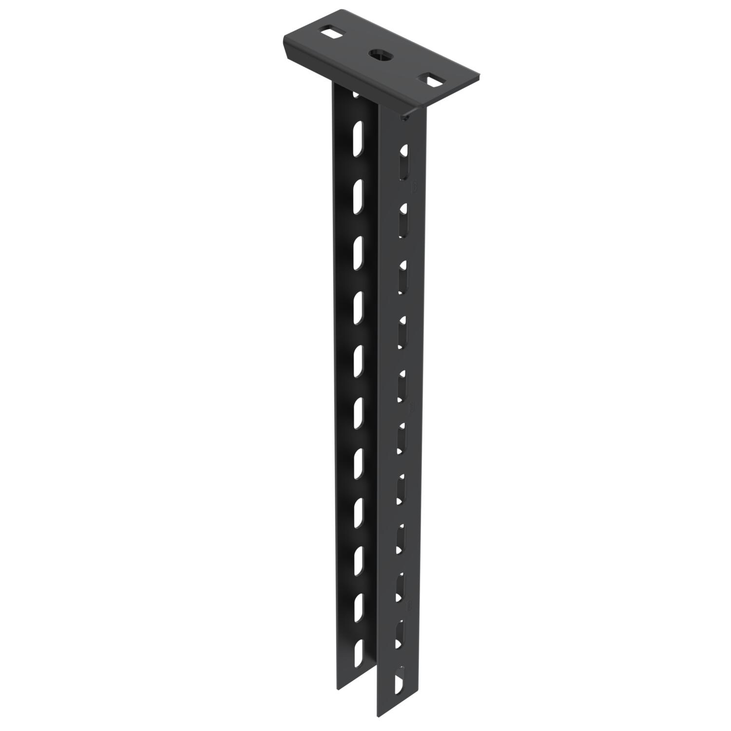Product descriptionSuspended support made from U profile with welded-on head plate, perforated to 3 sides, for the creation of support constructions for cable trays. Suitable for mounting on horizontal concrete ceilings and steel supports. Wall and support bracket can be mounted on both sides of the U suspended support. Spacer DSK to insert, from bracket width 400 mm or when mounting the bracket on the end of the suspended support. With black powder coating.