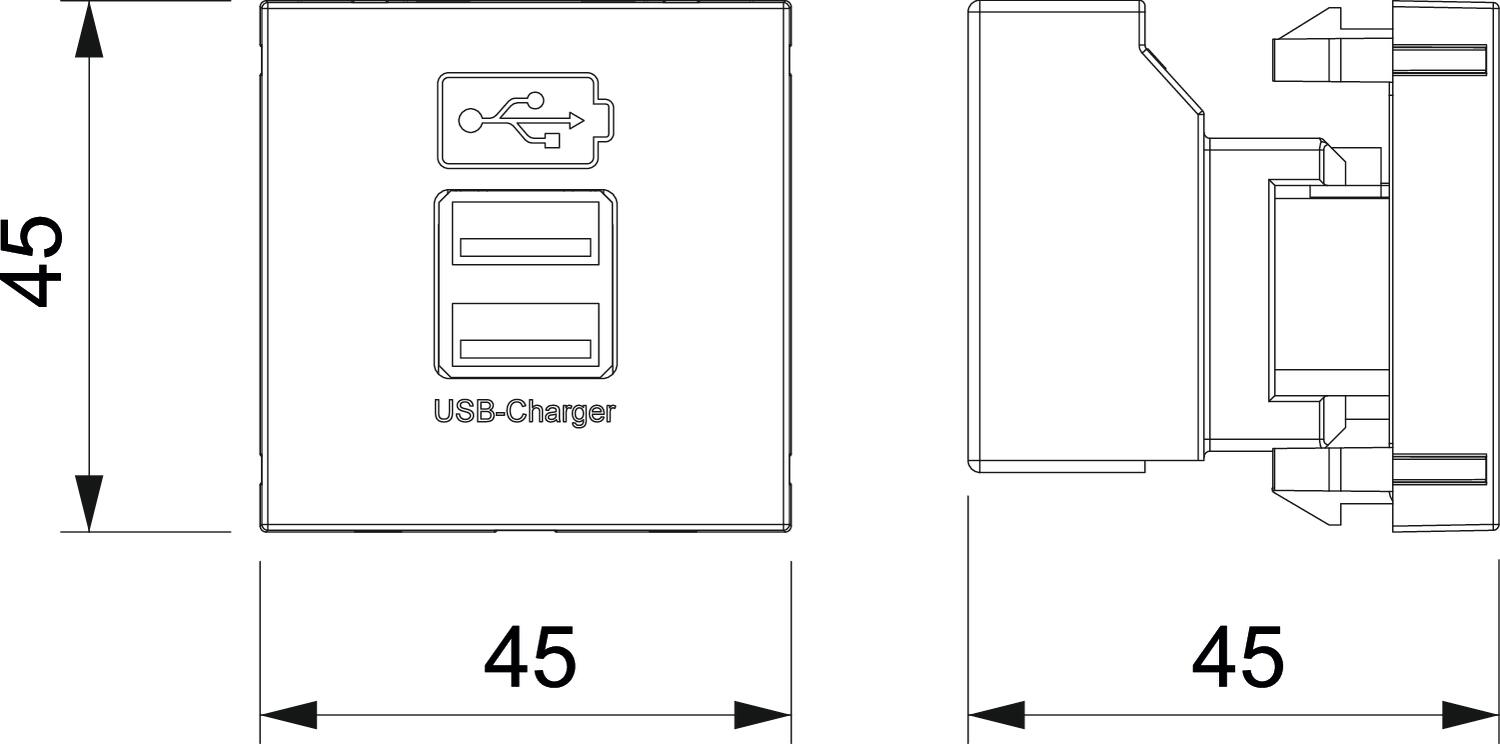 Product descriptionUSB charging device with two USB type A sockets, for charging 1‒2 mobile devices, maximum charging current 1x 2,100 mA or 2x 1,050 mA.