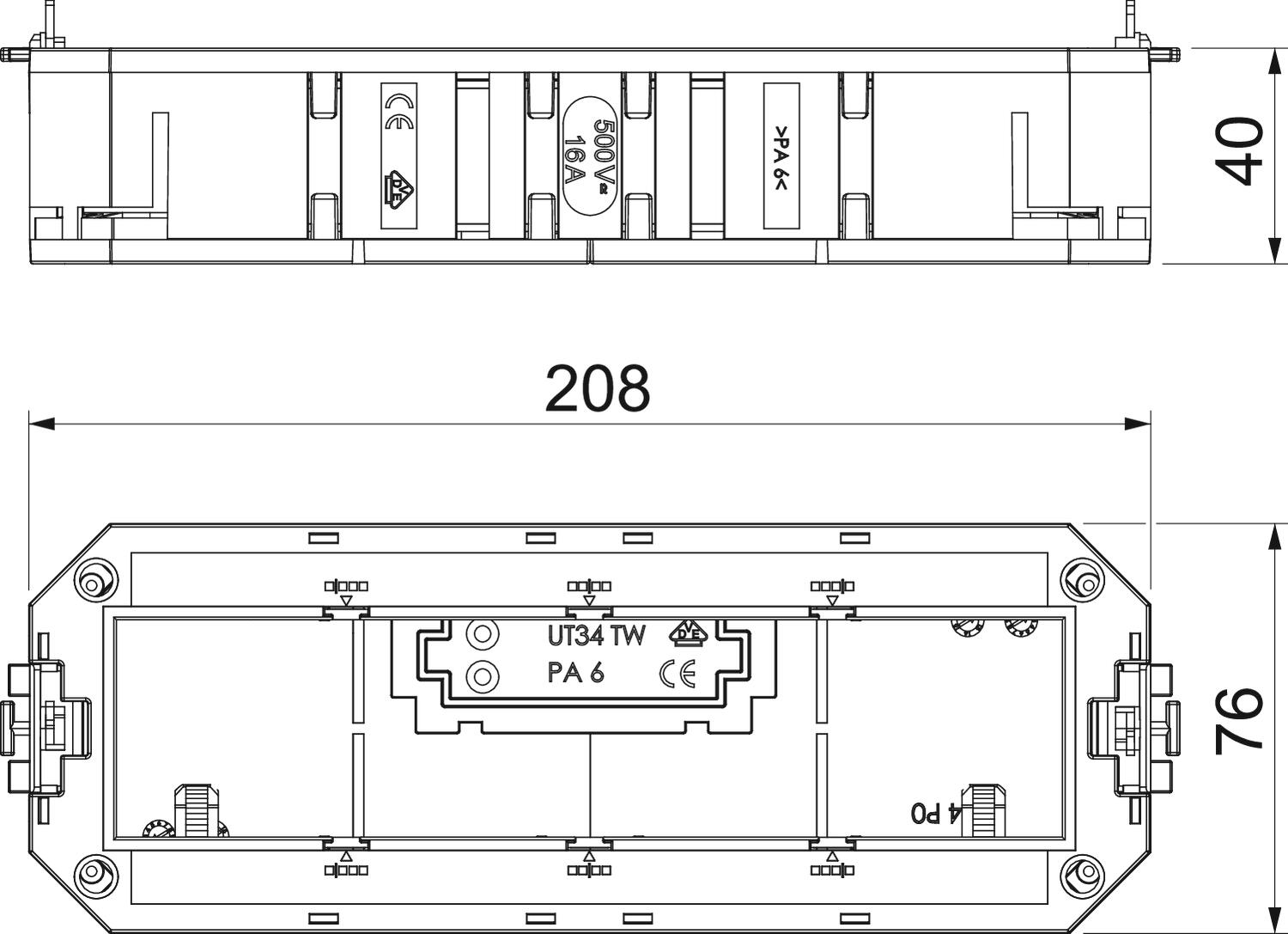 CO2 Footprint (GWP) Cradle-to-Gate 0,6706 kg CO2e / 1 Piece Colour Graphite black; RAL 9011 Dimension 208x76x40 Height 40 mm Installation technology Grid M45 Length 208 mm Material Polyamide No. of entries 4 Number of installable devices 4 Number of strain reliefs 2 Version for Socket shape Width 76 mm - All types
