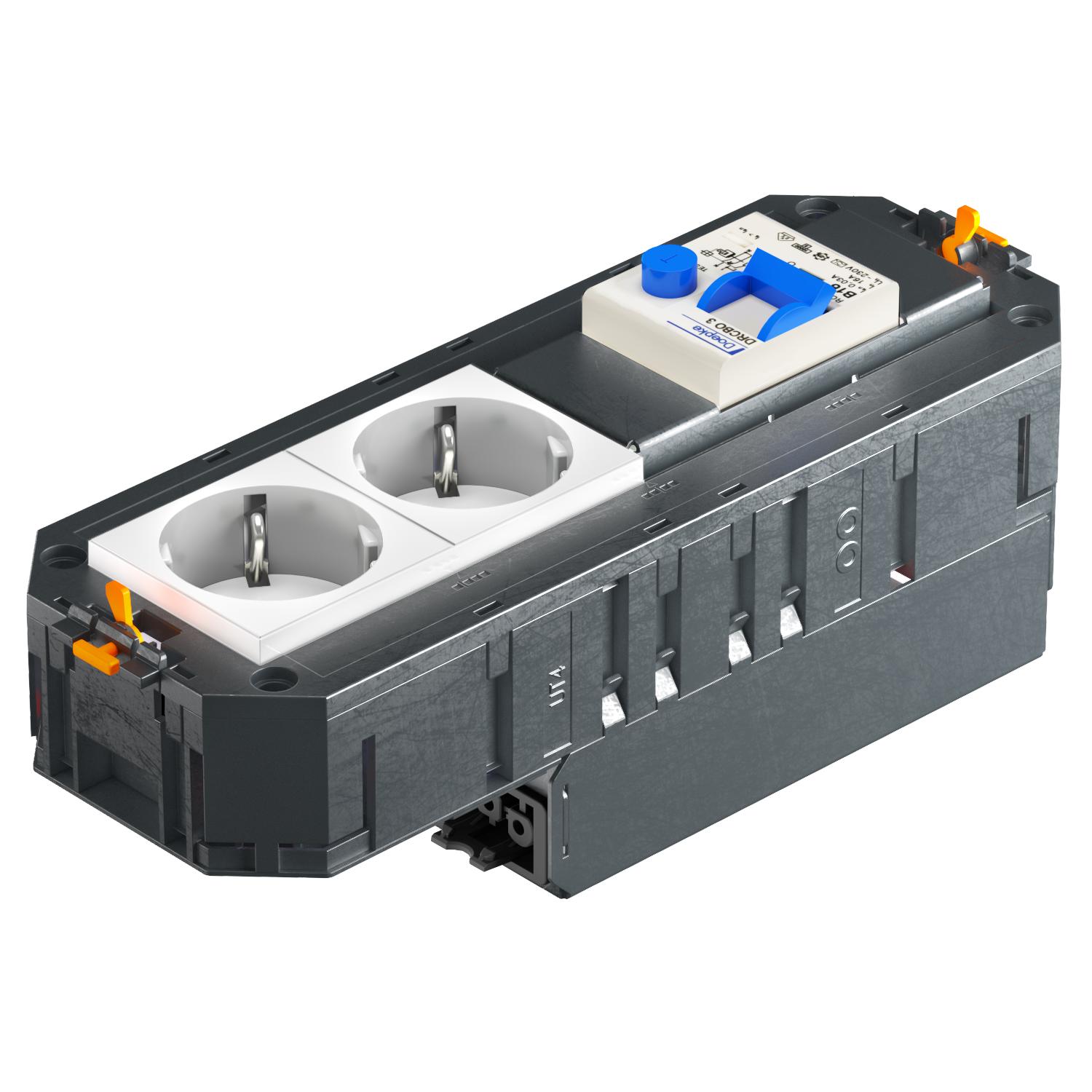 The ready-for-connection UTC4 FI universal support has 2 protective contact sockets protected with FI/LS. Internal wiring with 2.5 mm². Please note the connection requirements (and also the selectivity).
