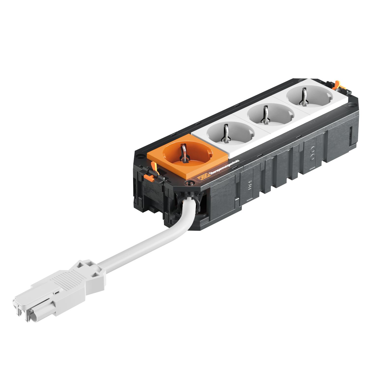 Product descriptionReady-for-connection universal support UTC4 with halogen-free connection cable. It possesses three pre-installed 33° protective contact sockets in white and one 33° protective contact socket in pure orange of 16 A. The protective contact socket in pure orange is protected by a type 3 surge protection module according to DIN EN 61643-11. Suitable for VL connection cables and device installation units of nominal size R7, R9 and 9.