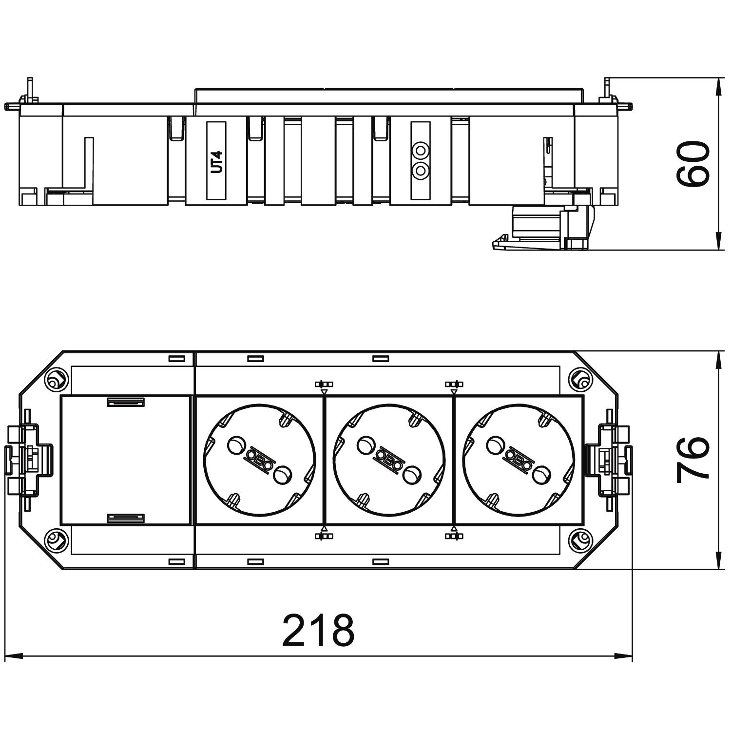 Product descriptionThe ready-for-connection UTC4 universal support possesses three pre-installed 33° protective contact sockets of 16 A and one blanking cover for retroinstallation of one installation device of the Modul 45 or Modul 45connect series. Suitable for VL connection cables and device installation units of nominal size R7, R9 and 9.