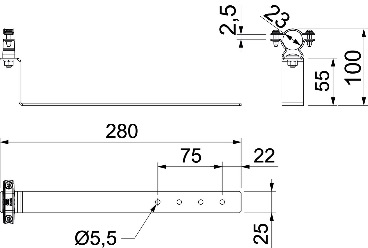 Application Pitched roof CO2 Footprint (GWP) Cradle-to-Gate 1,171 kg CO2e / 1 Piece Conductor diameter, min. 23 Conductor fastening type With clamp clip Connection Round conductor Dimension 280mm Dimension L 2,5 mm Length 280 mm Material Stainless steel 1.4301 Mounting height 55 mm Mounting type Screw-on - All types