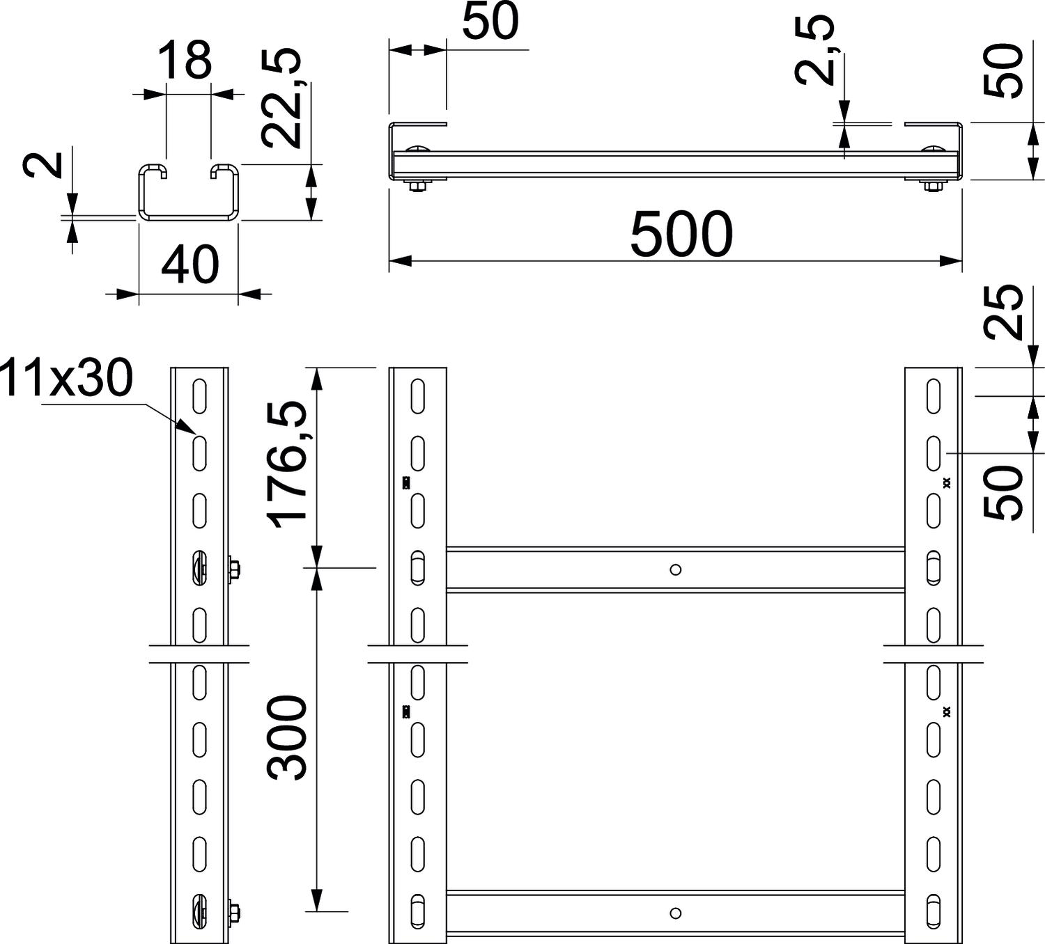 CO2 Footprint (GWP) Cradle-to-Gate 17,2941 kg CO2e / 1 Meter Colour zinc Dimension 500x3000mm Dimension B 500 mm Fire protection Maintenance of electrical function of standard support structure Height 50 mm Length 3000 mm Maintain electrical functions yes Material Steel Rung distance 300 mm Rung slot dimension 2,00 Rustproof steel, pickled no Side perforation yes Surface Hot-dip galvanised Version of the rungs Profile unperforated Width 500 mm - All types