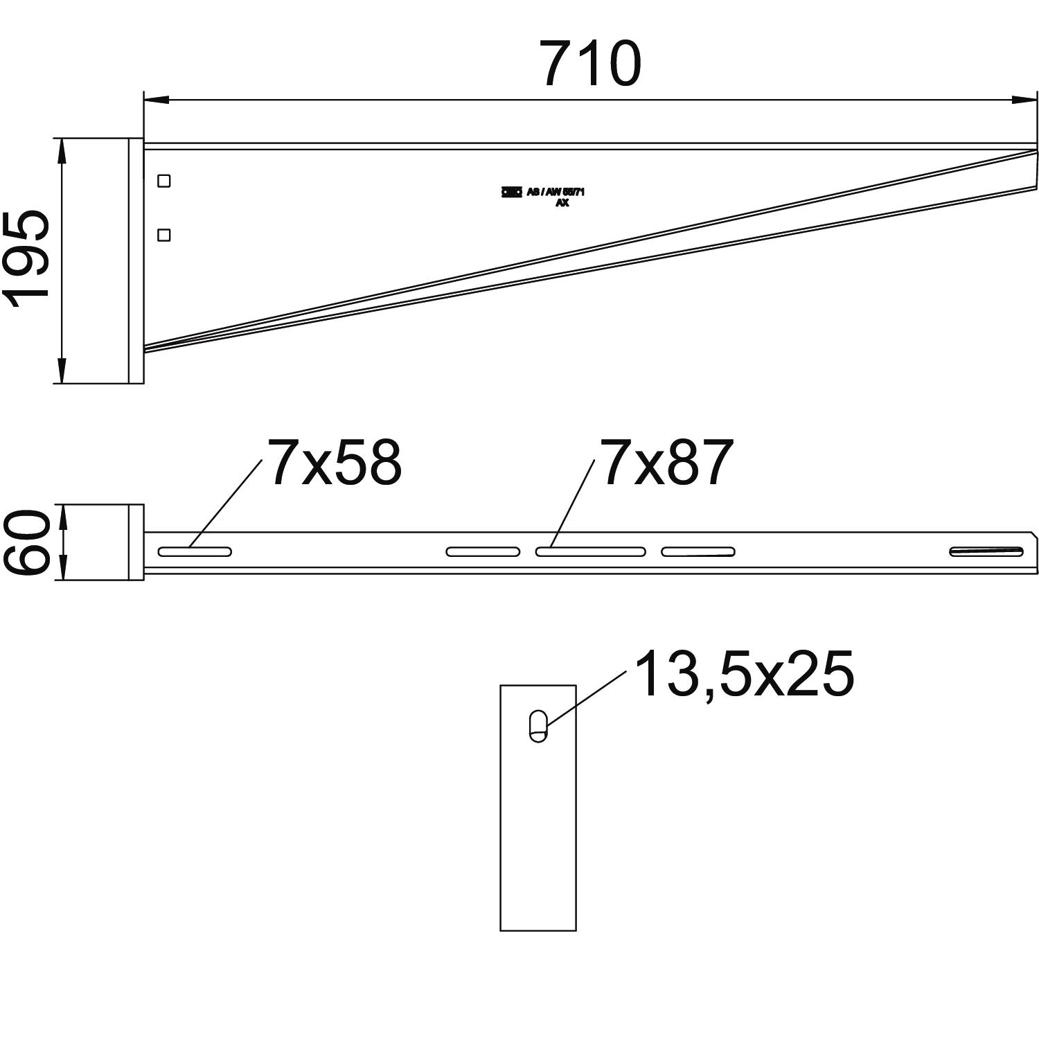 Angle range, max. 90 mm Angle range, min. 90 mm CO2 Footprint (GWP) Cradle-to-Gate 10,3033 kg CO2e / 1 Piece Colour zinc Dimension B710mm Dimension A 60 mm Dimension B 710 mm Dimension H 195 mm F in kN 5,5 kN Height 195 mm Hole diameter 13,5 mm Length 60 mm Maintain electrical functions no Material Steel Rustproof steel, pickled no Surface Hot-dip galvanised Version for Wall and support bracket Width 710 mm Technical data