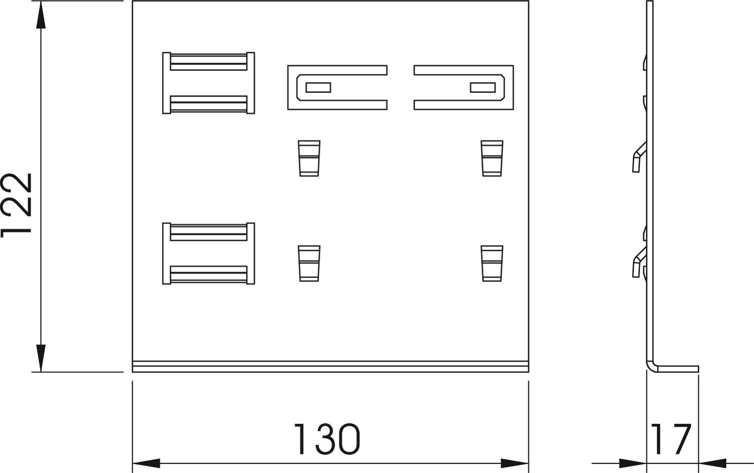 CO2 Footprint (GWP) Cradle-to-Gate 0,8889 kg CO2e / 1 Piece Colour zinc Dimension 128x122x27mm Fastening type Lockable for duct dimension 70x130 mm Height 17 mm Length 130 mm Material Steel Permitted temperature range, max. 60 °C Permitted temperature range, min. -15 °C Protection rating IP30 Protection rating IK code IK08 Surface Strip galvanized Version for Wall mounting Width 122 mm - All types