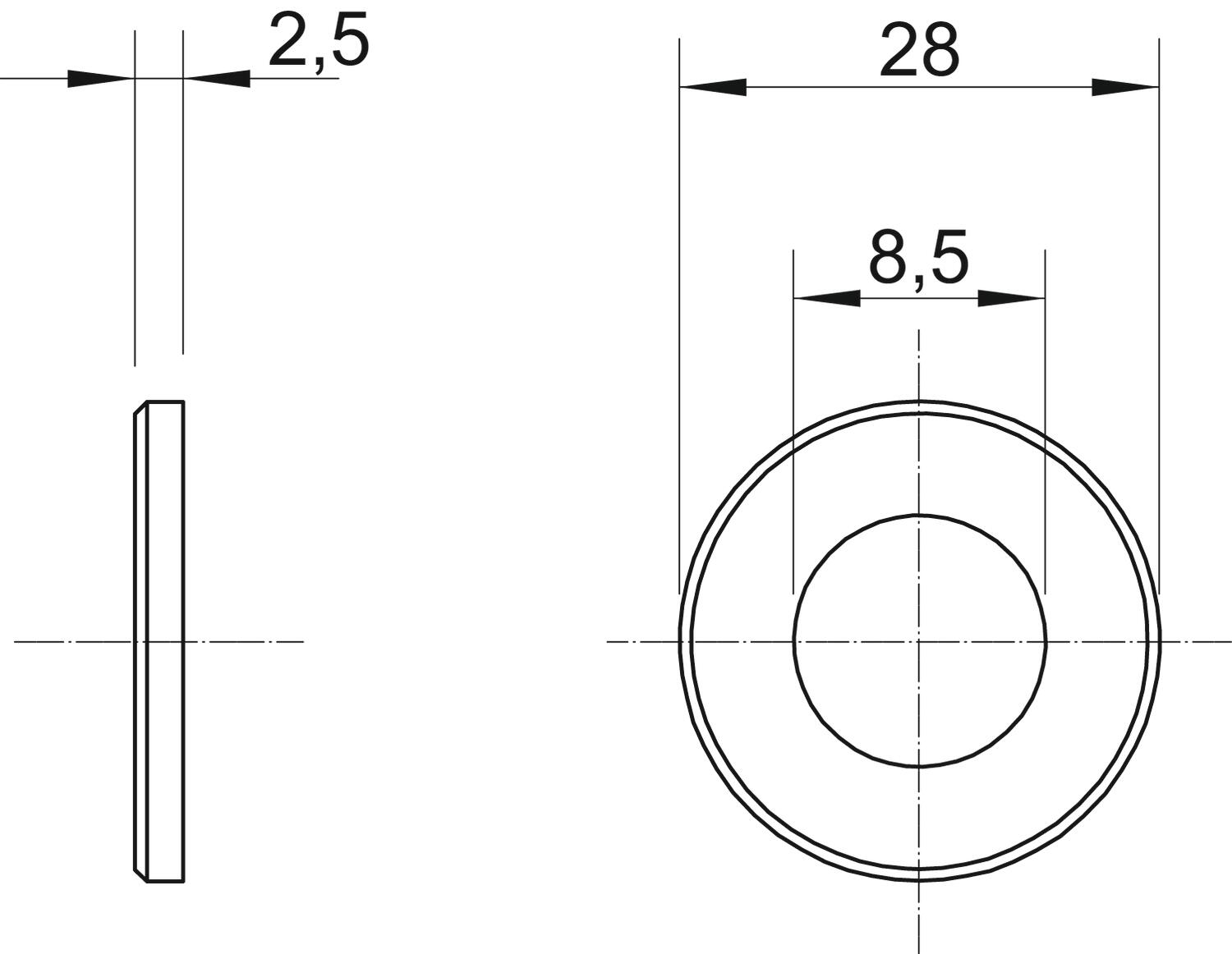 CO2 Footprint (GWP) Cradle-to-Gate 0,034 kg CO2e / 1 Piece Dimension M8 Dimension d 8,5 mm Dimension d min. 28 mm Dimension h 2,5 mm External diameter 28 mm Hole shape Round Inner diameter 8,5 mm Material Steel Material thickness 2,5 mm Plate thickness 0,1 in Surface Electrogalvanized Thread M8 With toothing no - All types