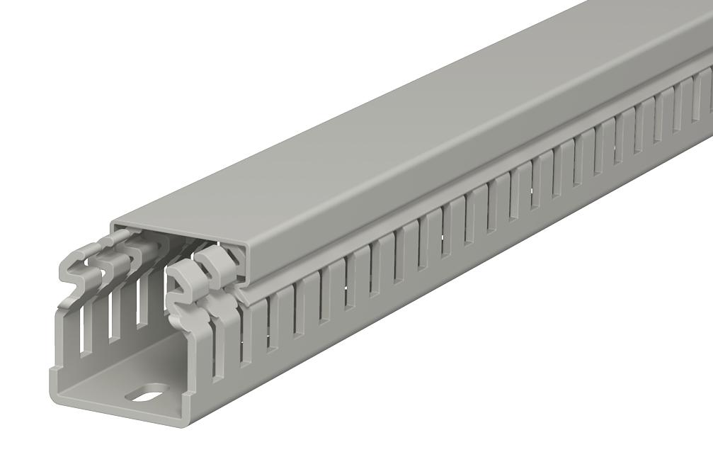 Product descriptionWiring duct according to DIN EN 50085-2-3, incl. cover and base perforation, for horizontal and vertical routing of electrical cables in the switchgear cabinet. Designed as a DIN duct. Retainers are broken out without tools. The flush-floor routing of cables is possible through predetermined break points. Tested to DIN EN 50085-2-3. Special lengths on request.