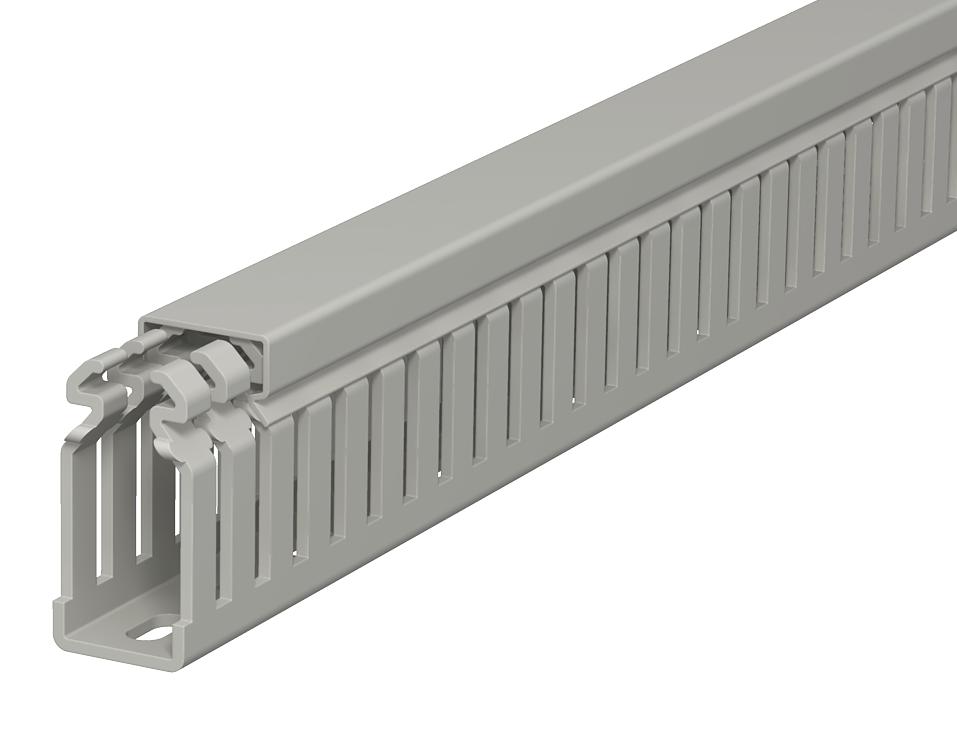 Product descriptionWiring duct according to DIN EN 50085-2-3, incl. cover and base perforation, for horizontal and vertical routing of electrical cables in the switchgear cabinet. Designed as a DIN duct. Retainers are broken out without tools. The flush-floor routing of cables is possible through predetermined break points. Tested to DIN EN 50085-2-3. Special lengths on request.