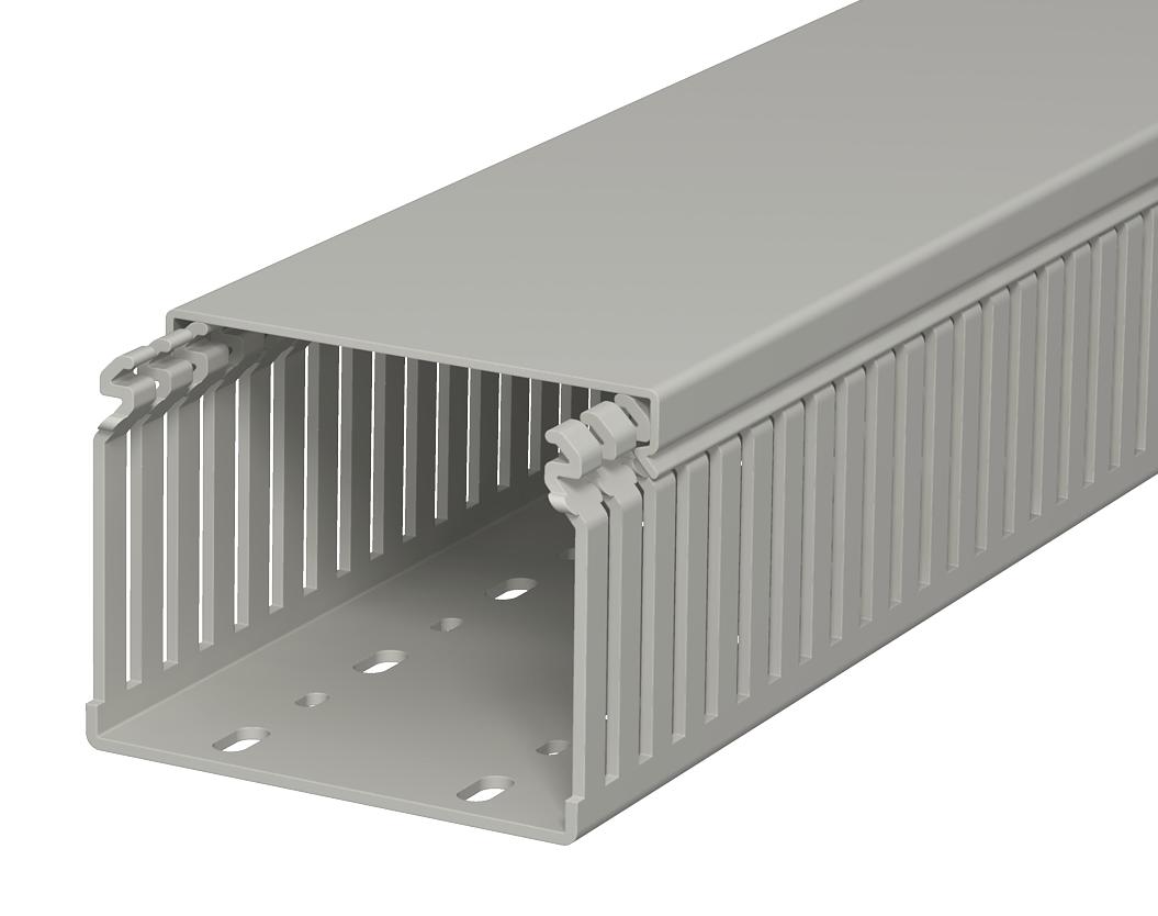 Product descriptionWiring duct according to DIN EN 50085-2-3, incl. cover and base perforation, for horizontal and vertical routing of electrical cables in the switchgear cabinet. Designed as a DIN duct. Retainers are broken out without tools. The flush-floor routing of cables is possible through predetermined break points. Tested to DIN EN 50085-2-3. Special lengths on request.