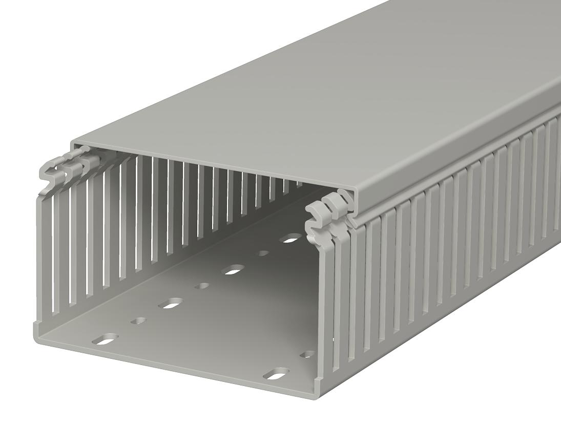 Product descriptionWiring duct according to DIN EN 50085-2-3, incl. cover and base perforation, for horizontal and vertical routing of electrical cables in the switchgear cabinet. Designed as a DIN duct. Retainers are broken out without tools. The flush-floor routing of cables is possible through predetermined break points. Tested to DIN EN 50085-2-3. Special lengths on request.