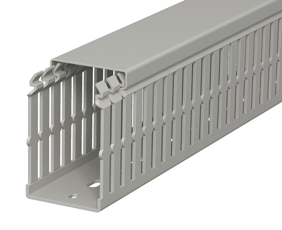 Product descriptionWiring duct according to DIN EN 50085-2-3, incl. cover and base perforation, for horizontal and vertical routing of electrical cables in the switchgear cabinet. Designed as a DIN duct. Retainers are broken out without tools. The flush-floor routing of cables is possible through predetermined break points. Tapering in the side slots prevents the cables from falling out. Tested to DIN EN 50085-2-3. Special lengths on request.