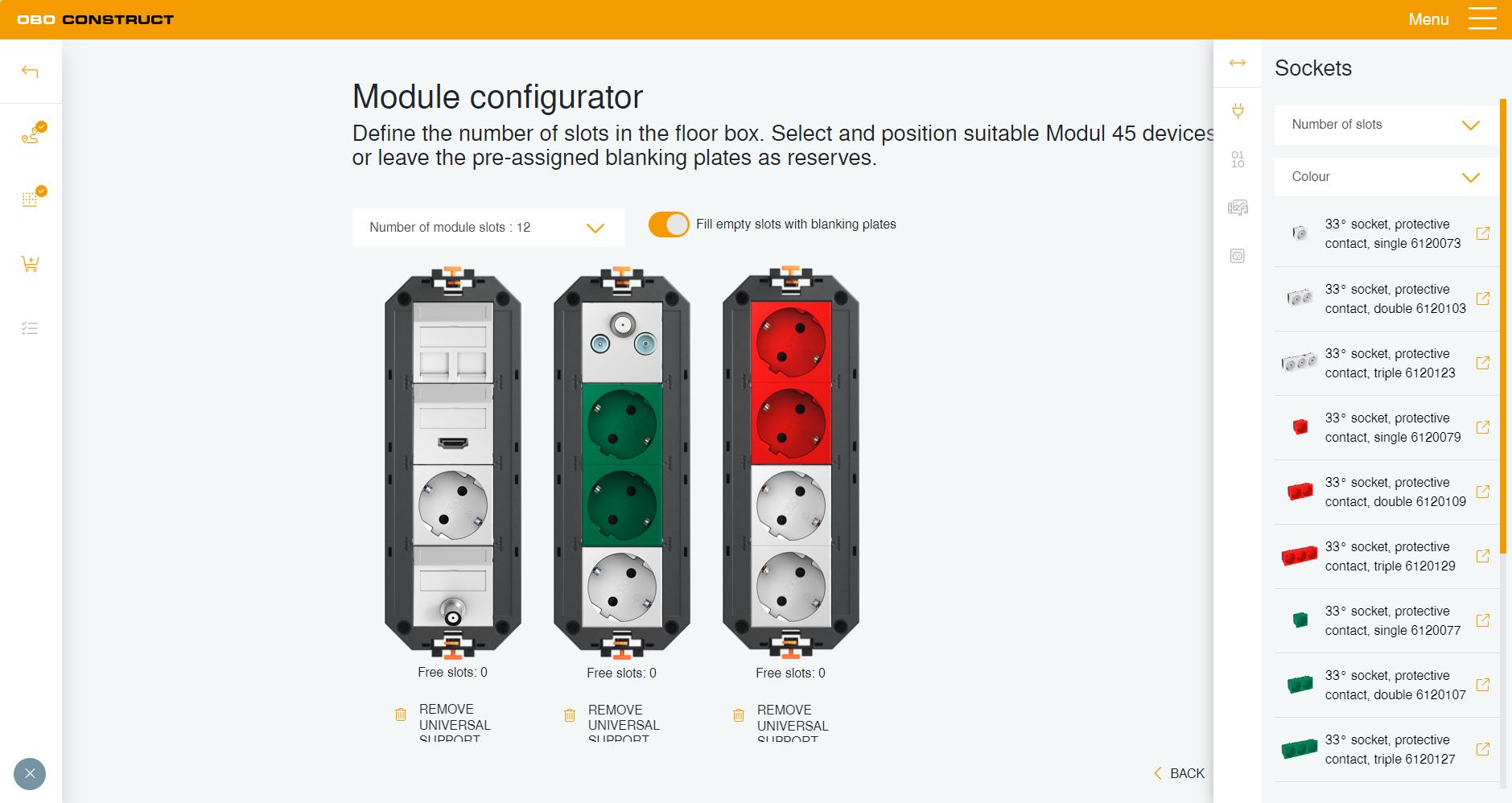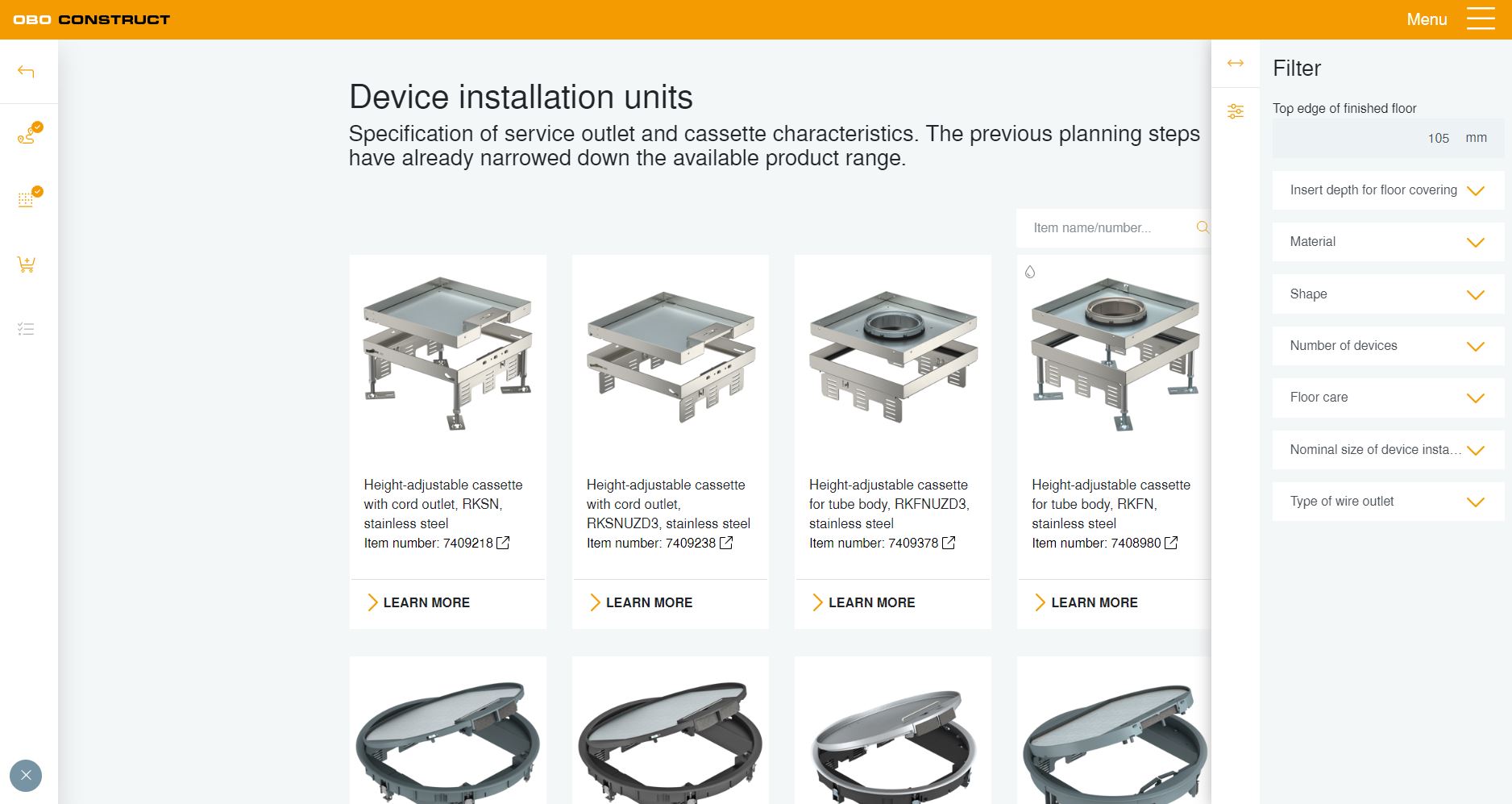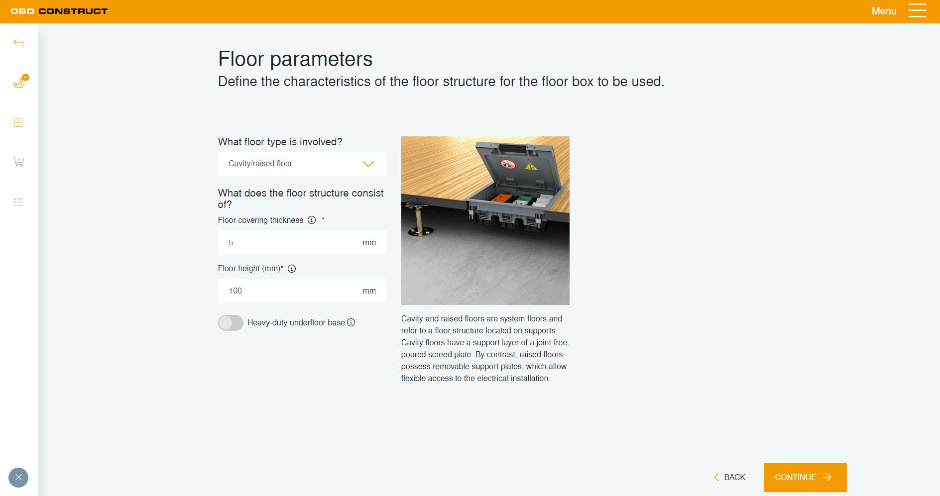 With the OBO Construct planning tool for underfloor systems, you can create floor boxes for raised and cavity floors, as well as for screed-covered duct systems that fit your project.
