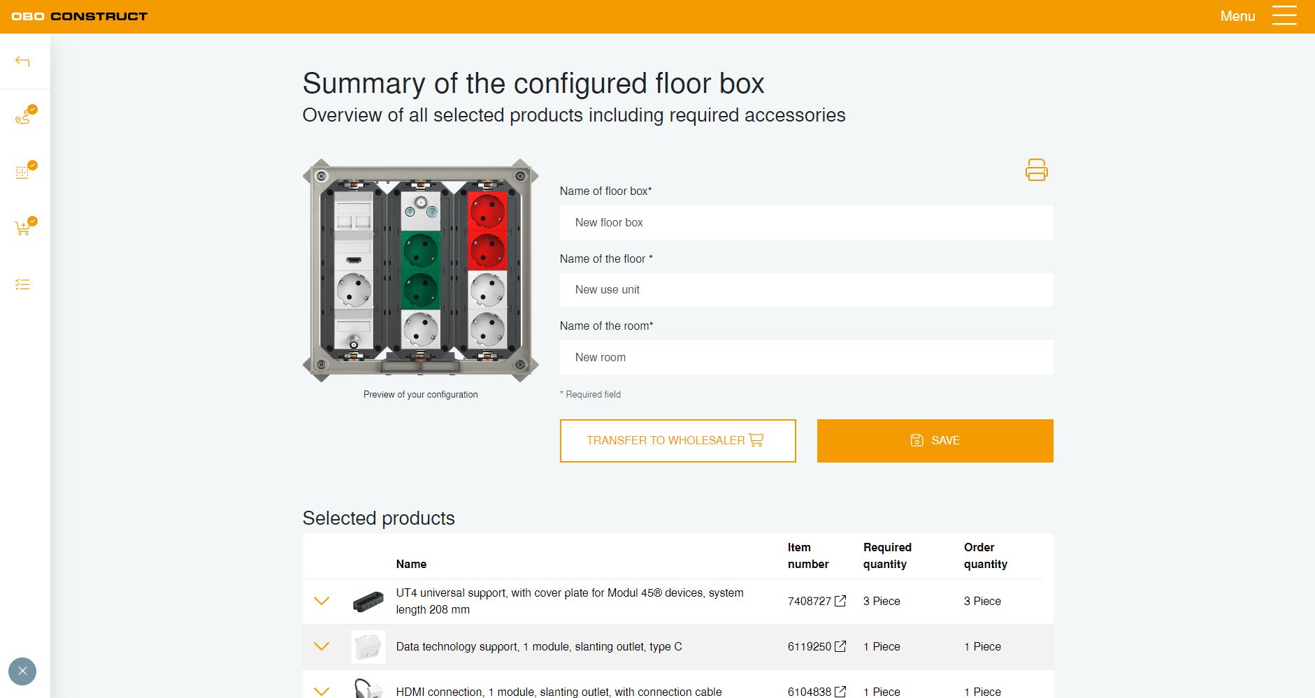 - Export configuration results: Material lists in Excel format and downloads of floor box graphics
